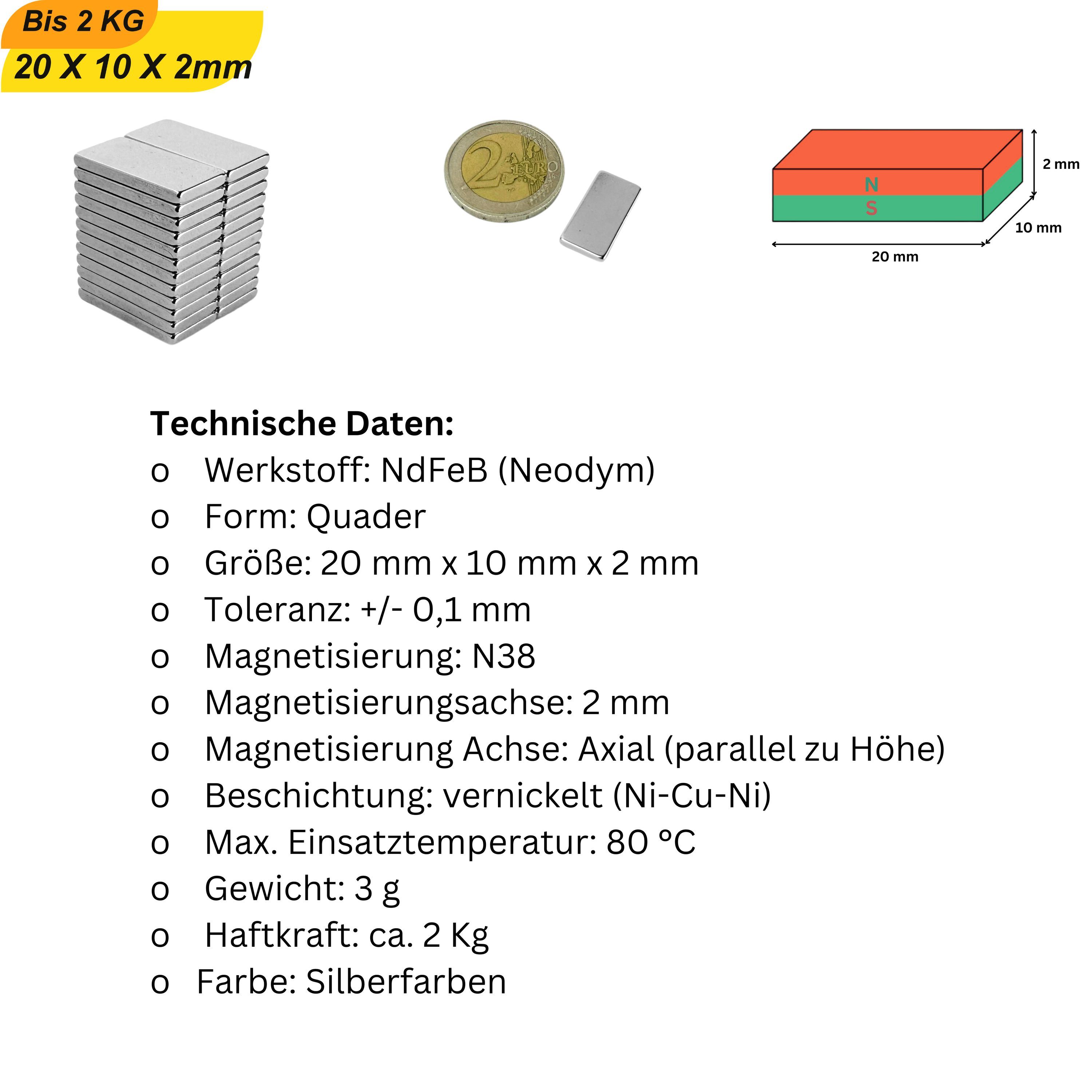 5 Stück Neodym Magnet 20mm x 10mm x 2mm - N38 Supermagnet - Quadermagnete - Hohe Haft