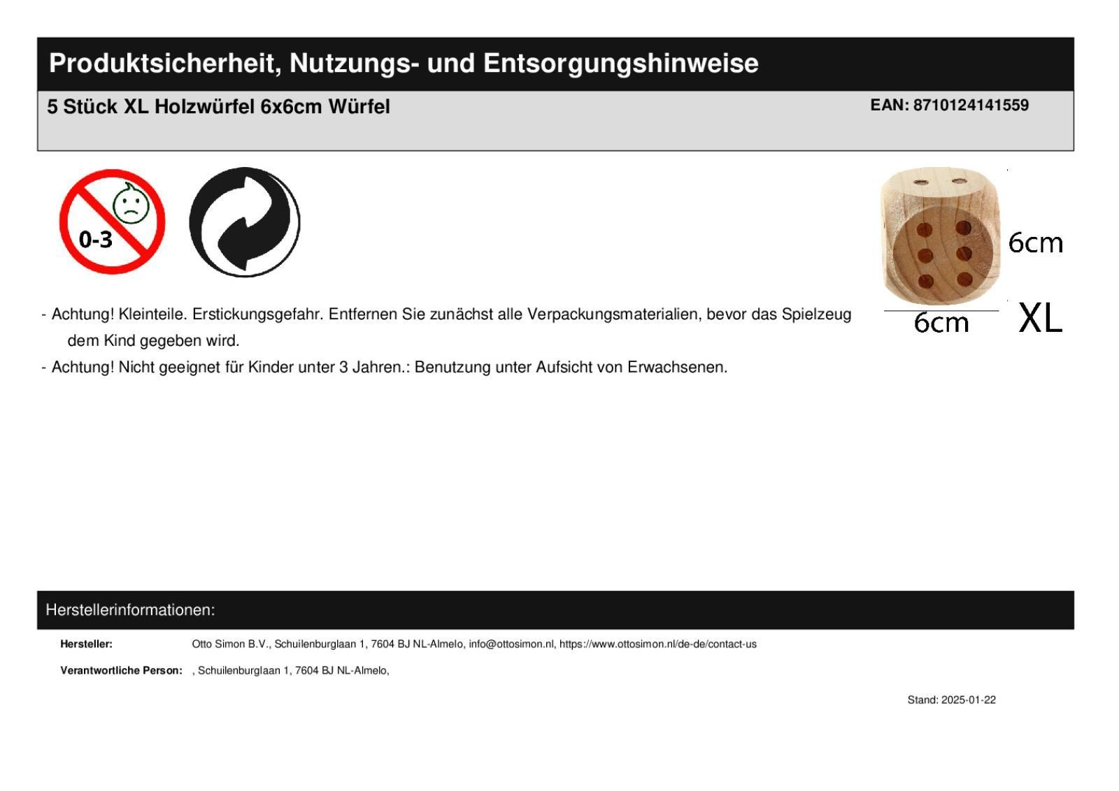 5 Stück XL Holzwürfel 6x6cm Würfel Echtholz Massivholz Spielwürfel extra groß