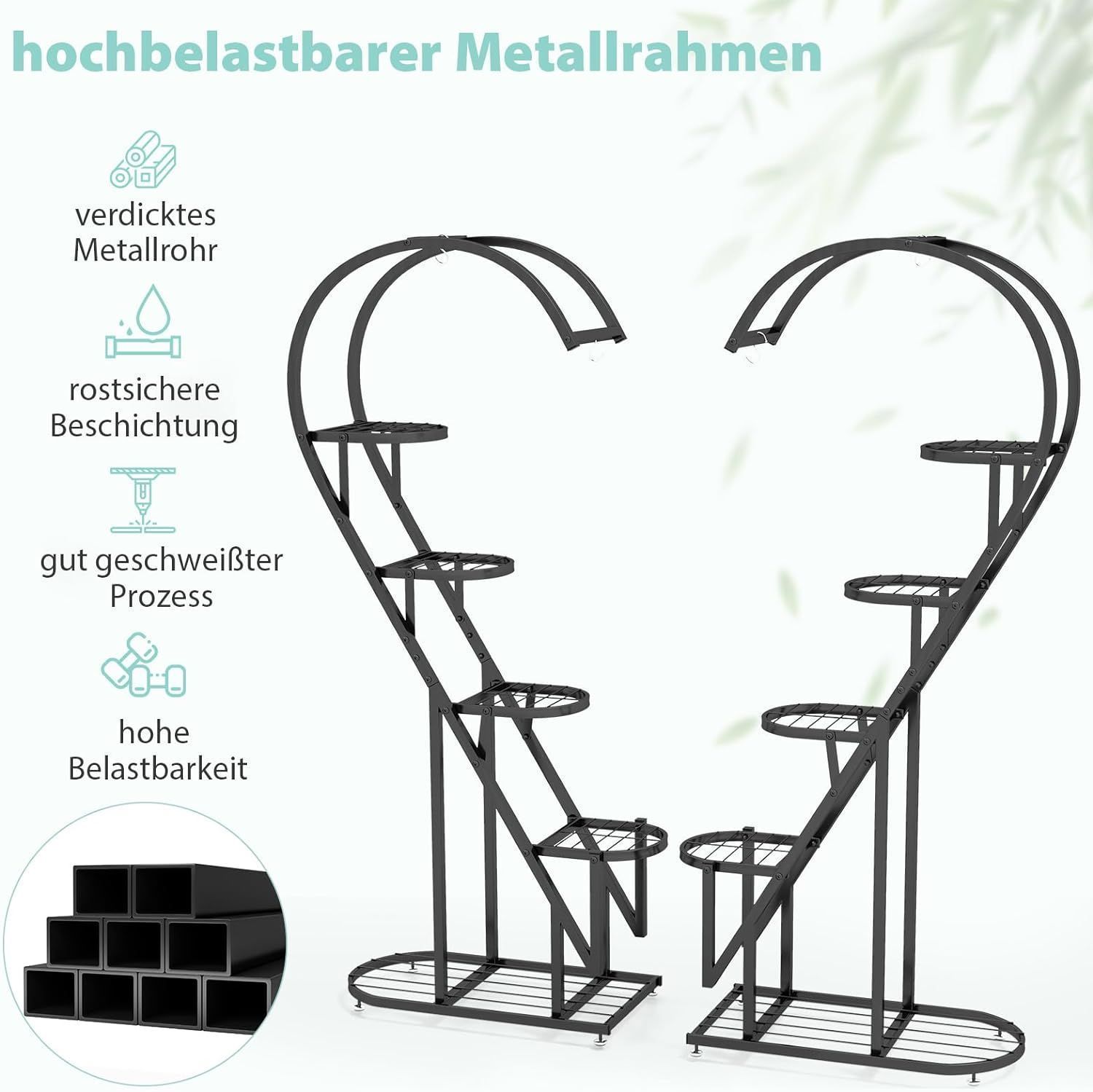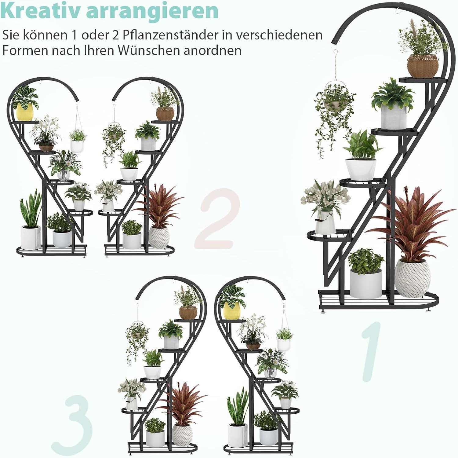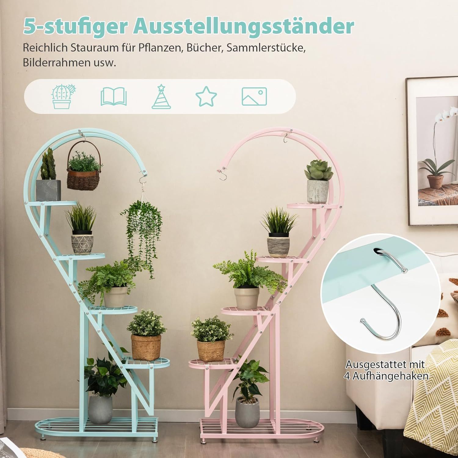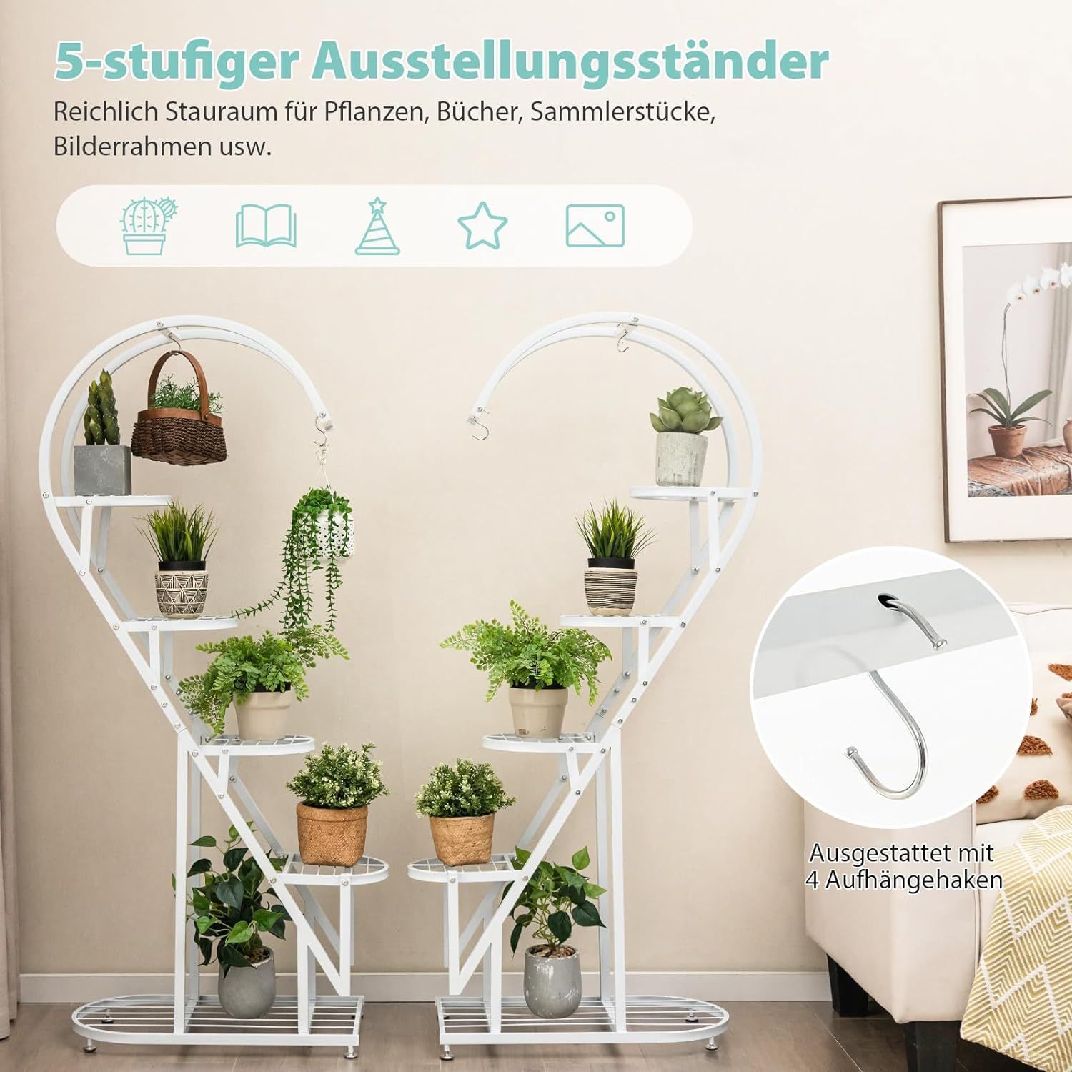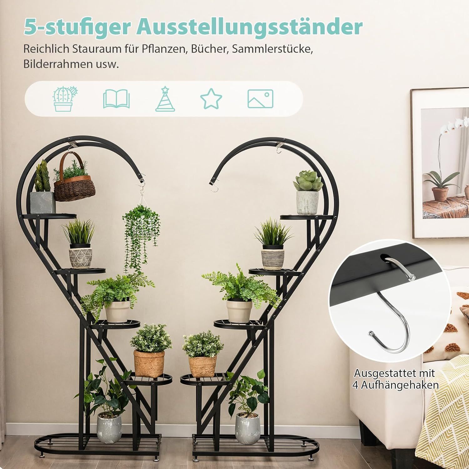 5-stufiger Metall Pflanzenständer Herzförmig, Blumenregal mit Haken, Pflanzenregale