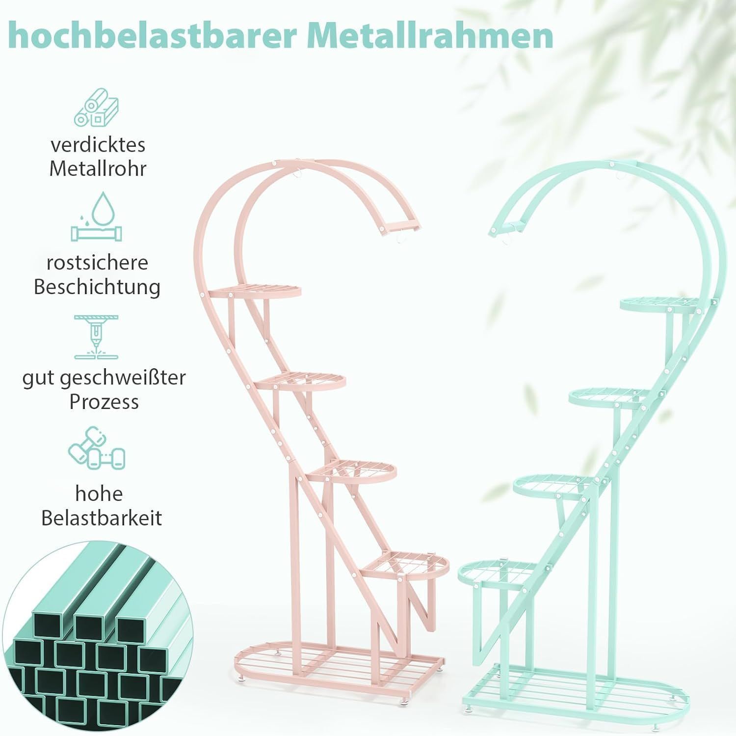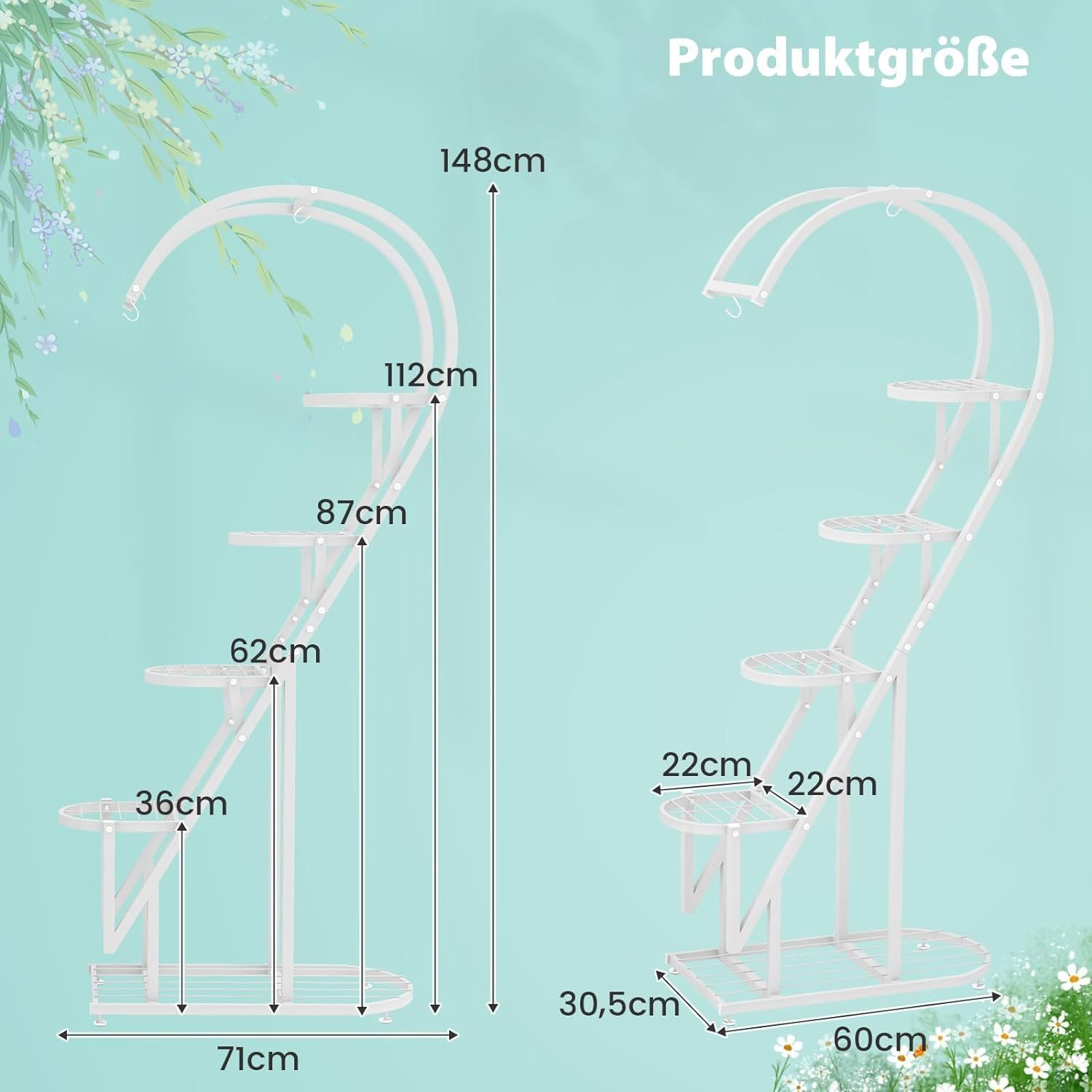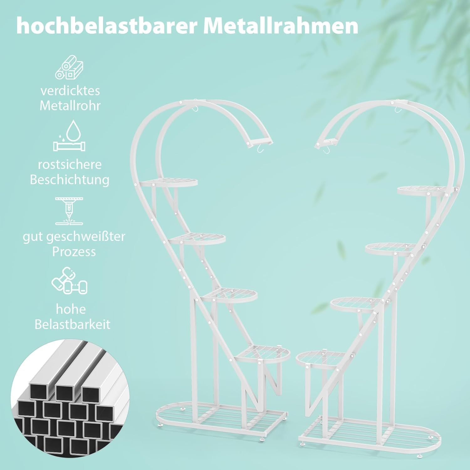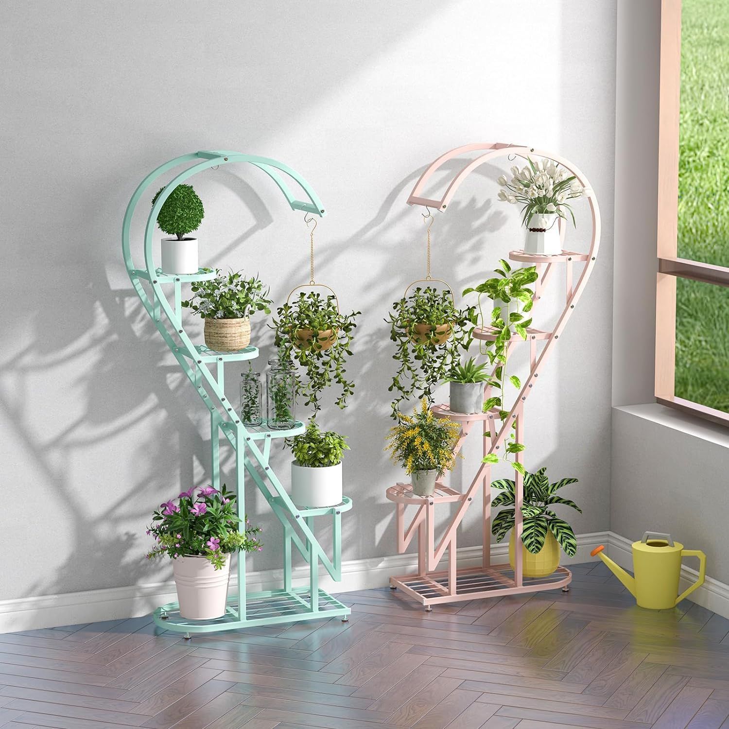 5-stufiger Metall Pflanzenständer Herzförmig, Blumenregal mit Haken, Pflanzenregale