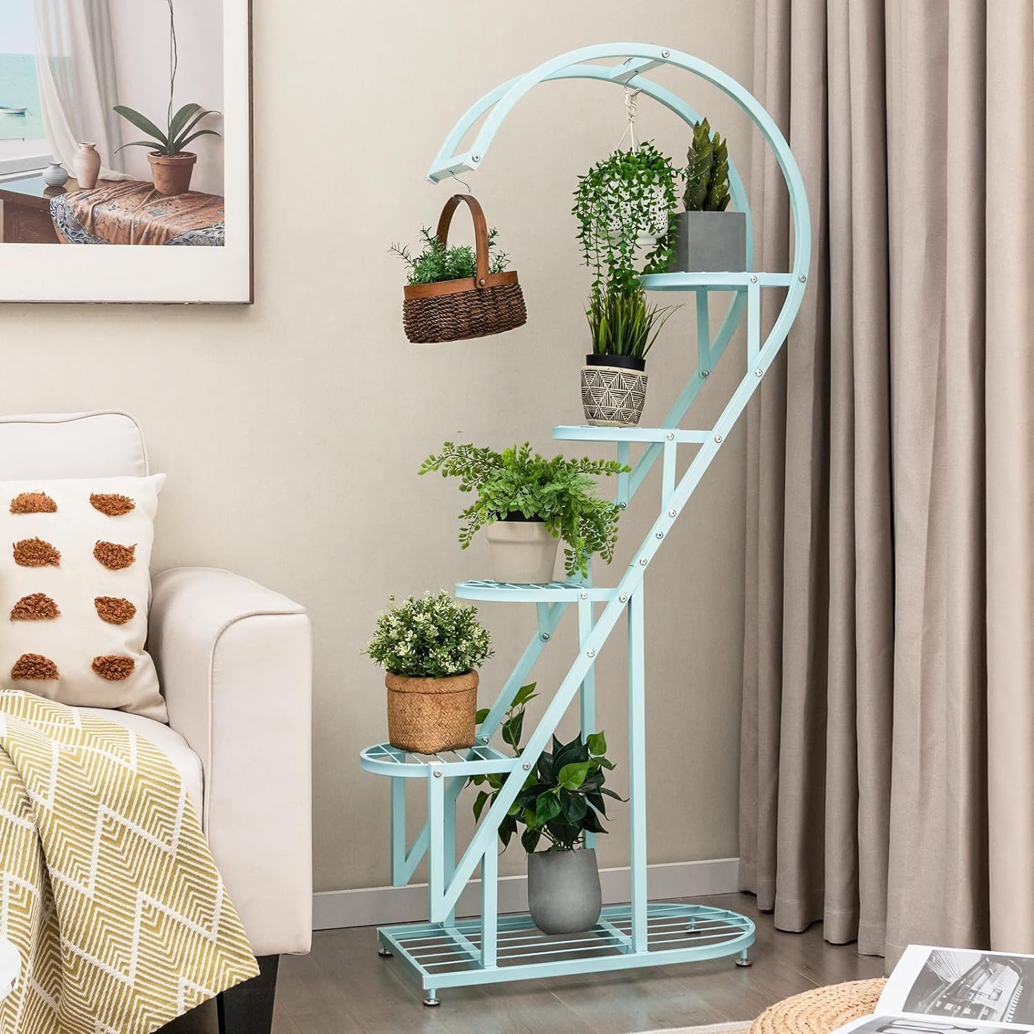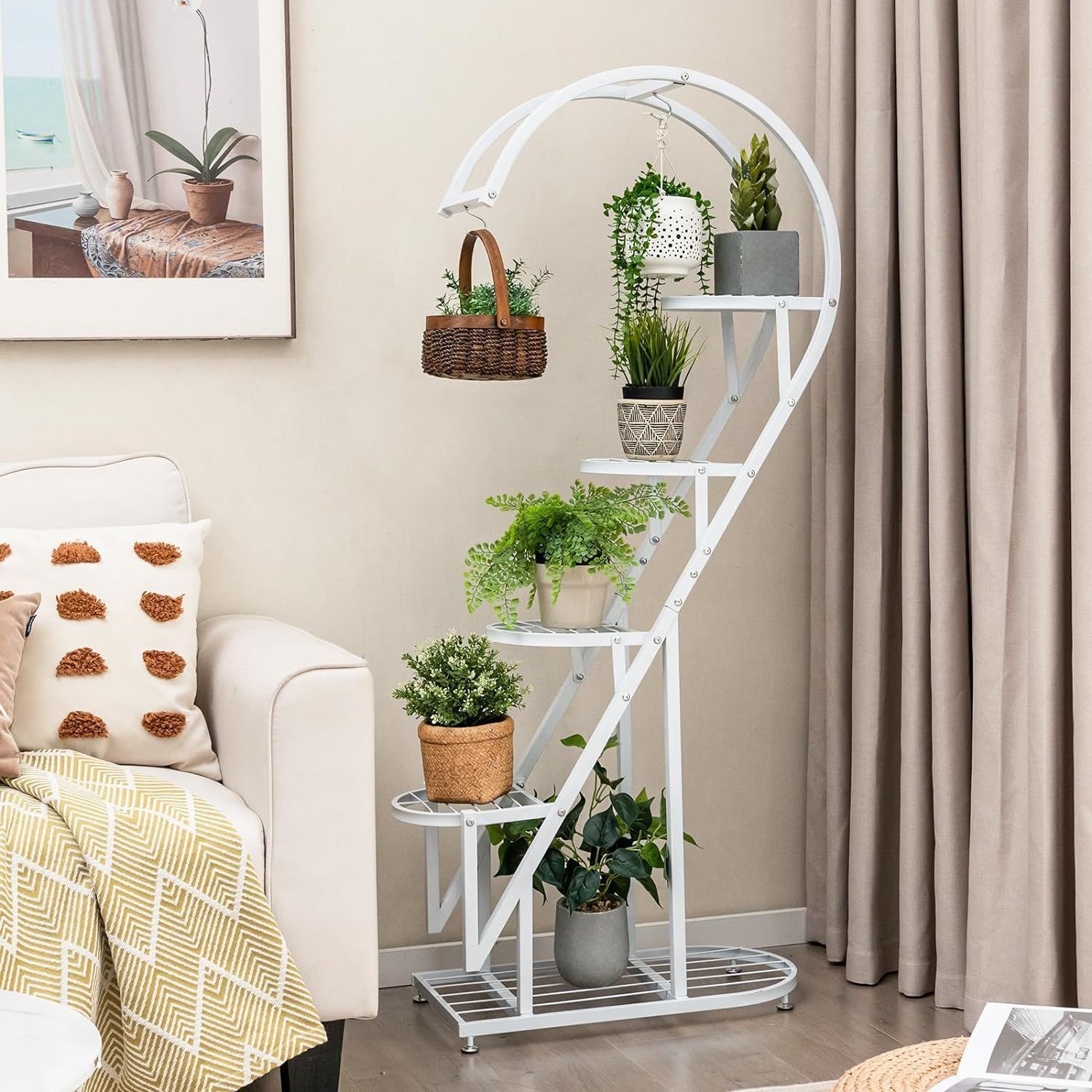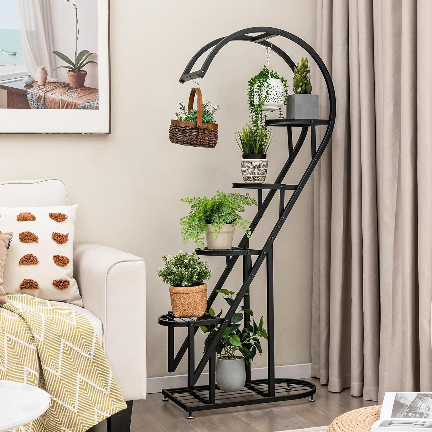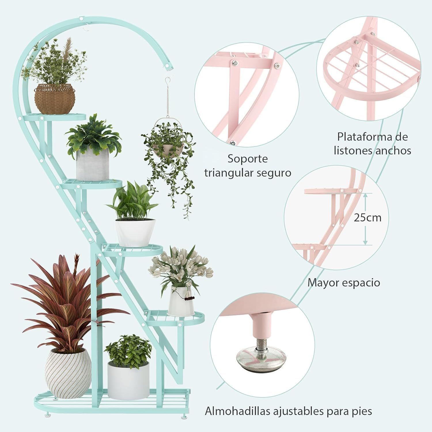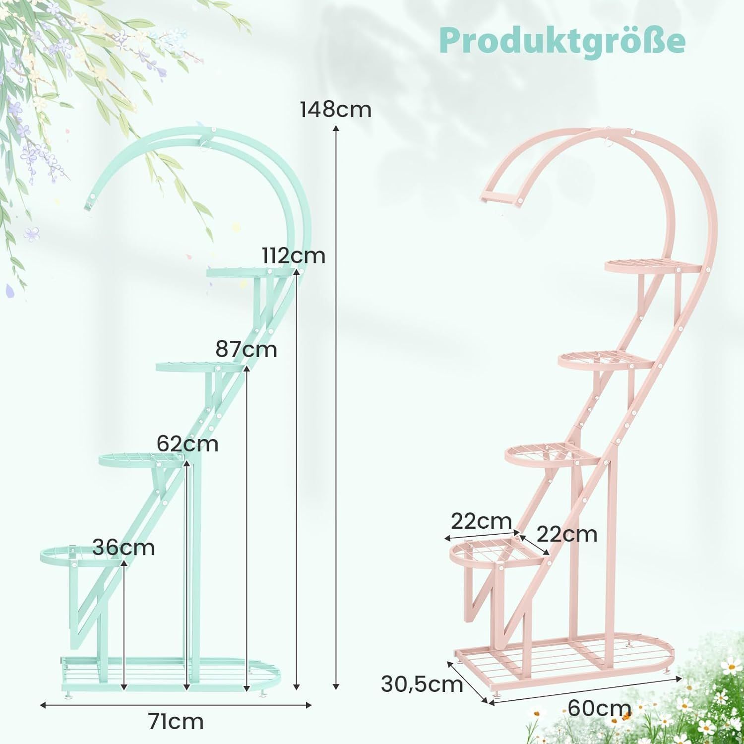 5-stufiger Metall Pflanzenständer Herzförmig, Blumenregal mit Haken, Pflanzenregale
