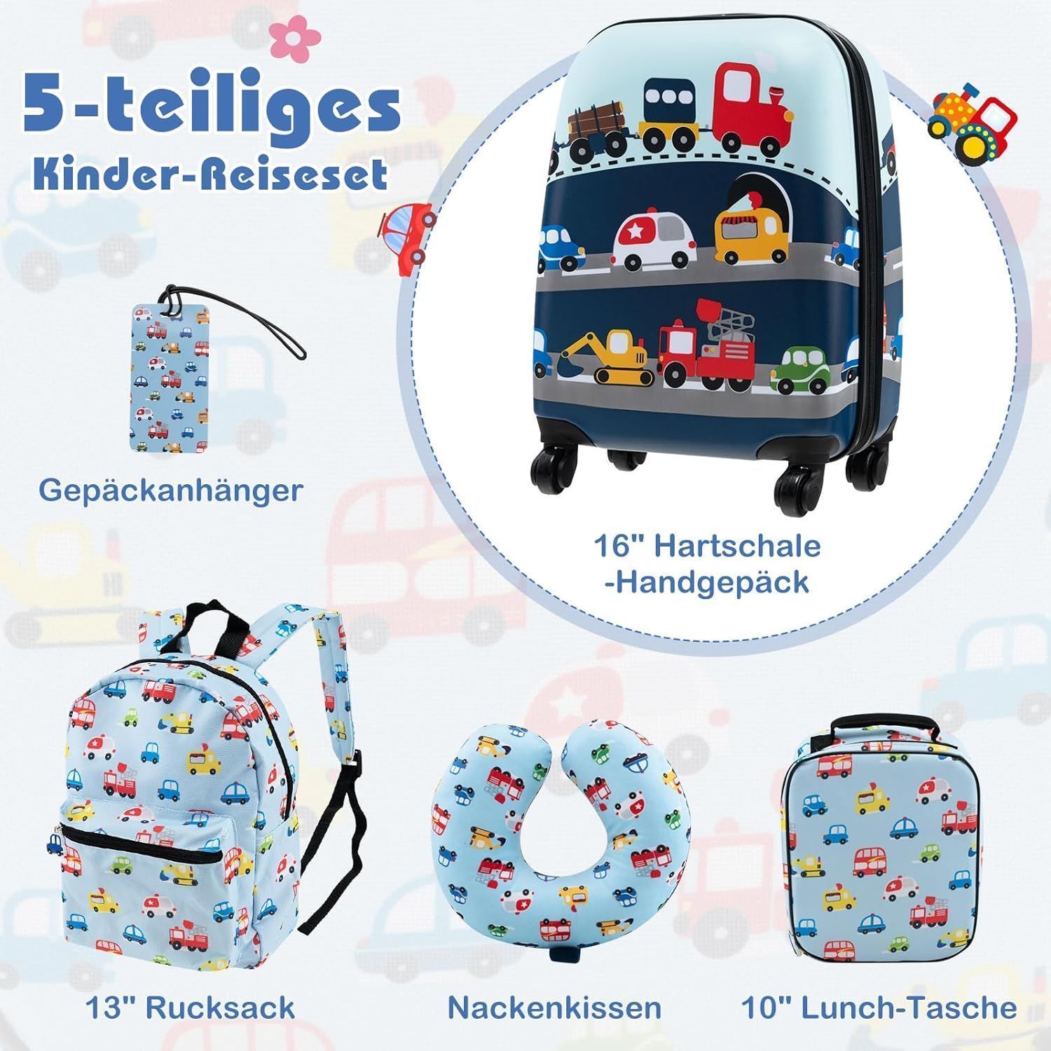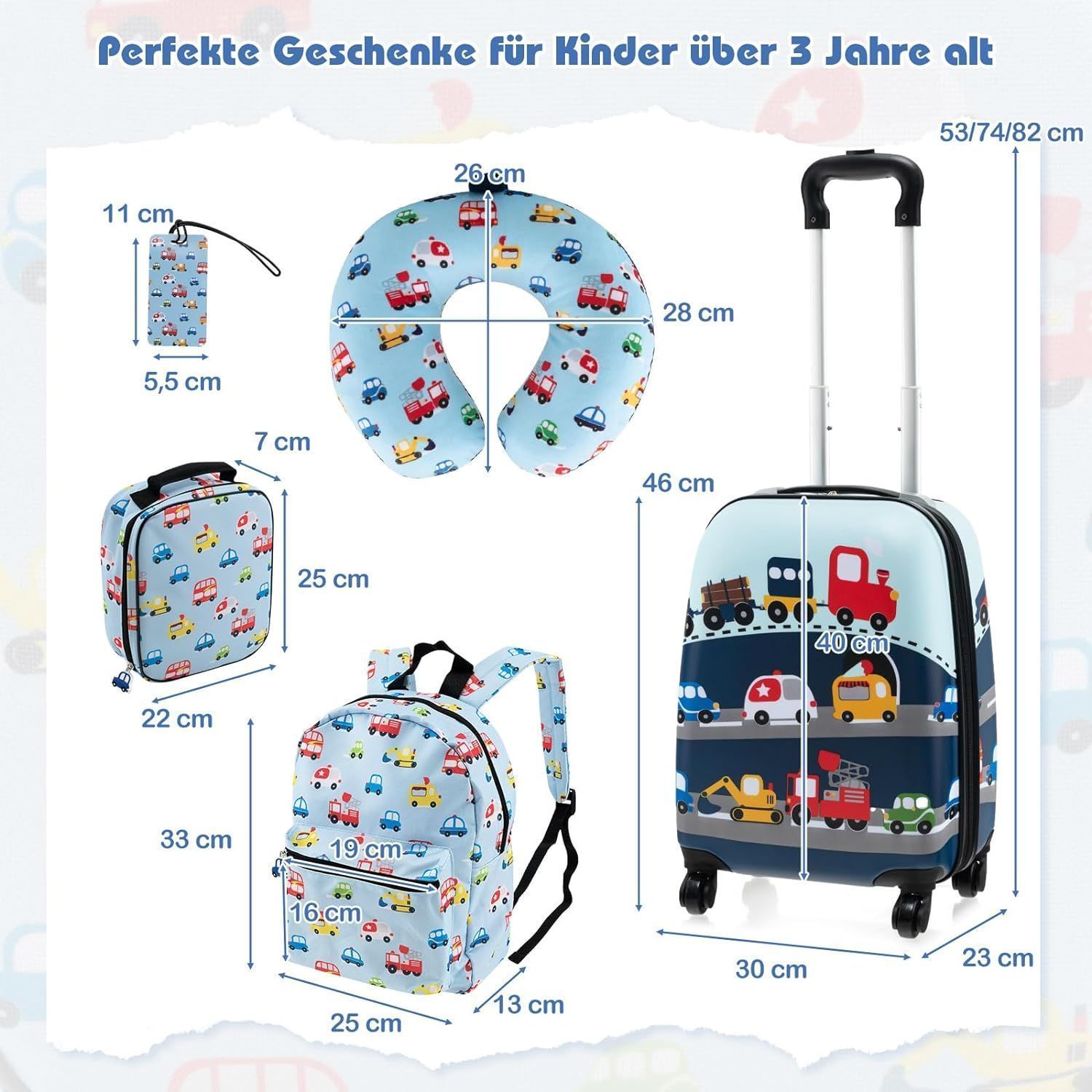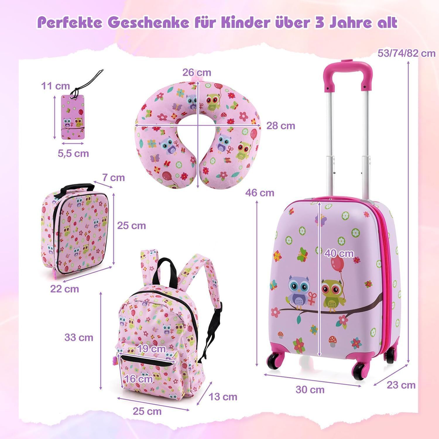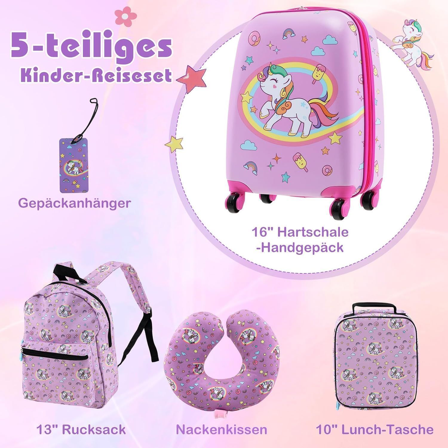 5 teiliges Kinderkoffer + Rucksack, Kindertrolley mit Lunchbox, Gepäckanhänger