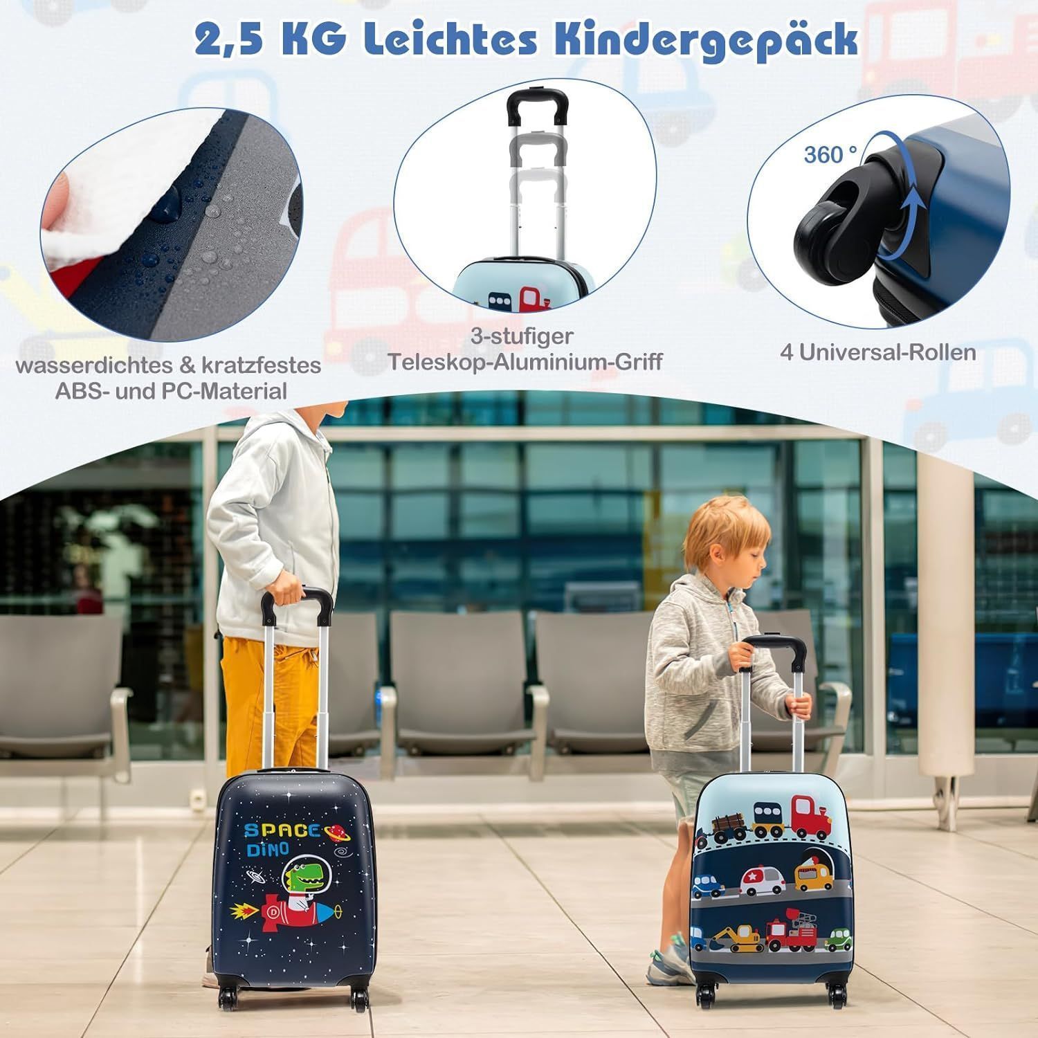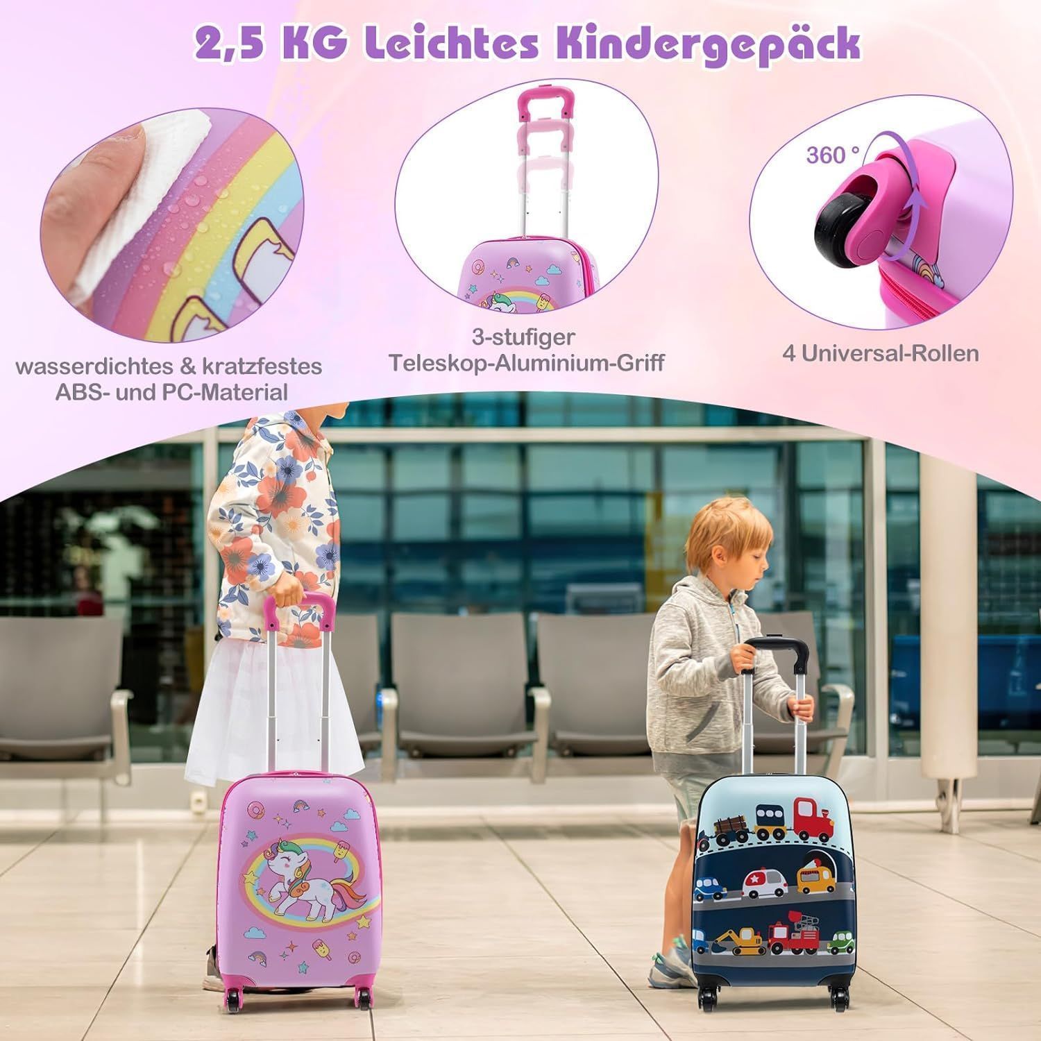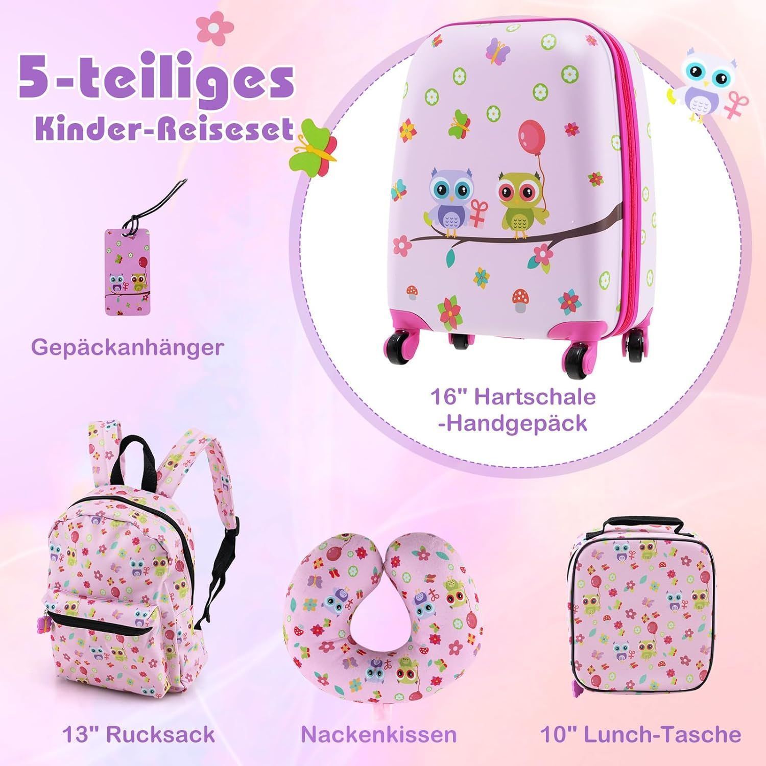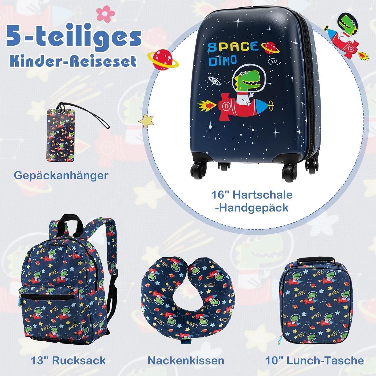 5 teiliges Kinderkoffer + Rucksack, Kindertrolley mit Lunchbox, Gepäckanhänger