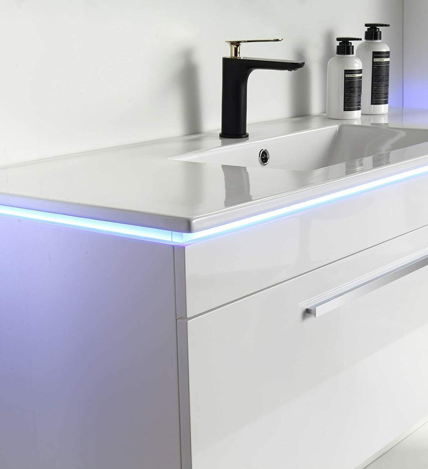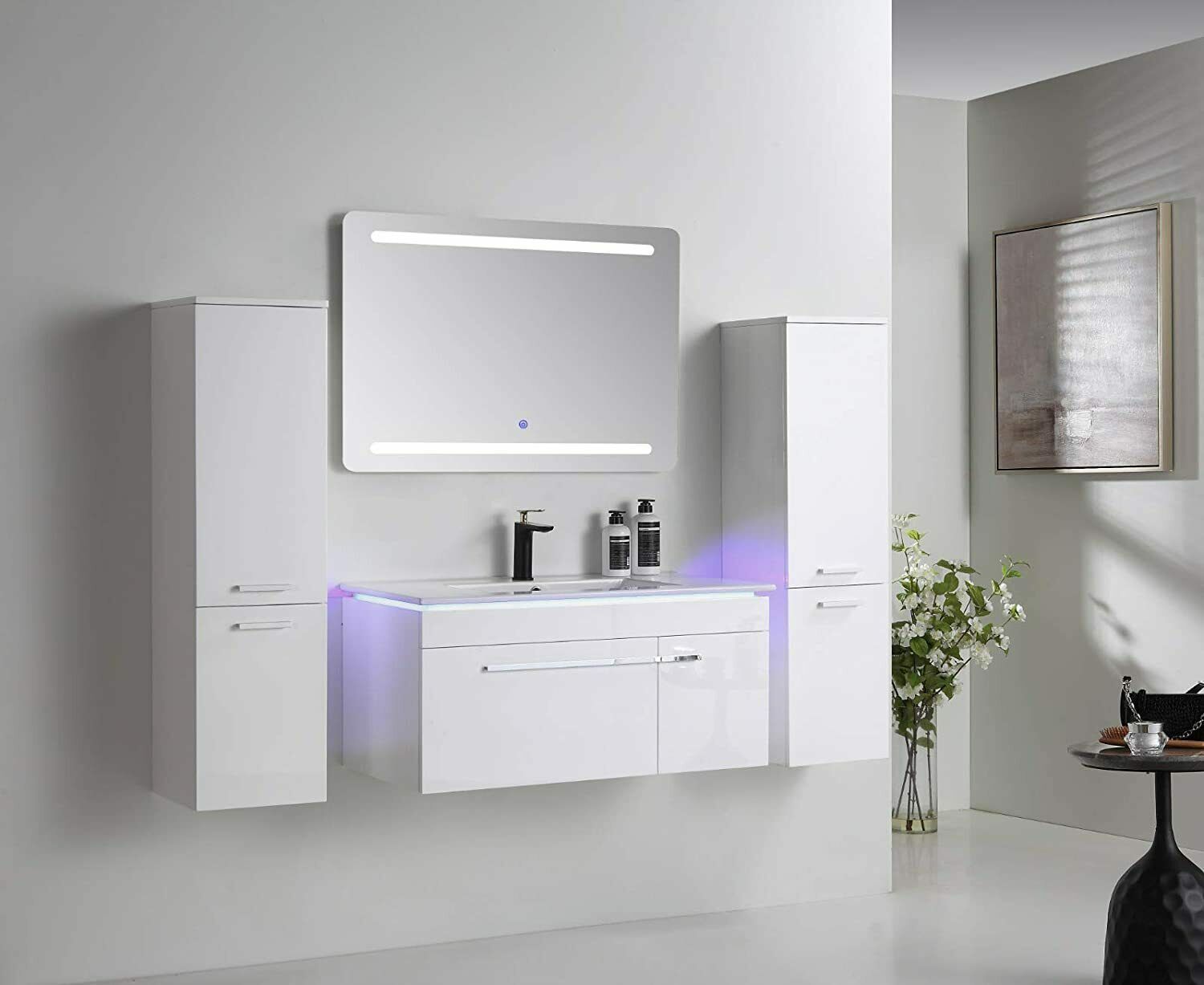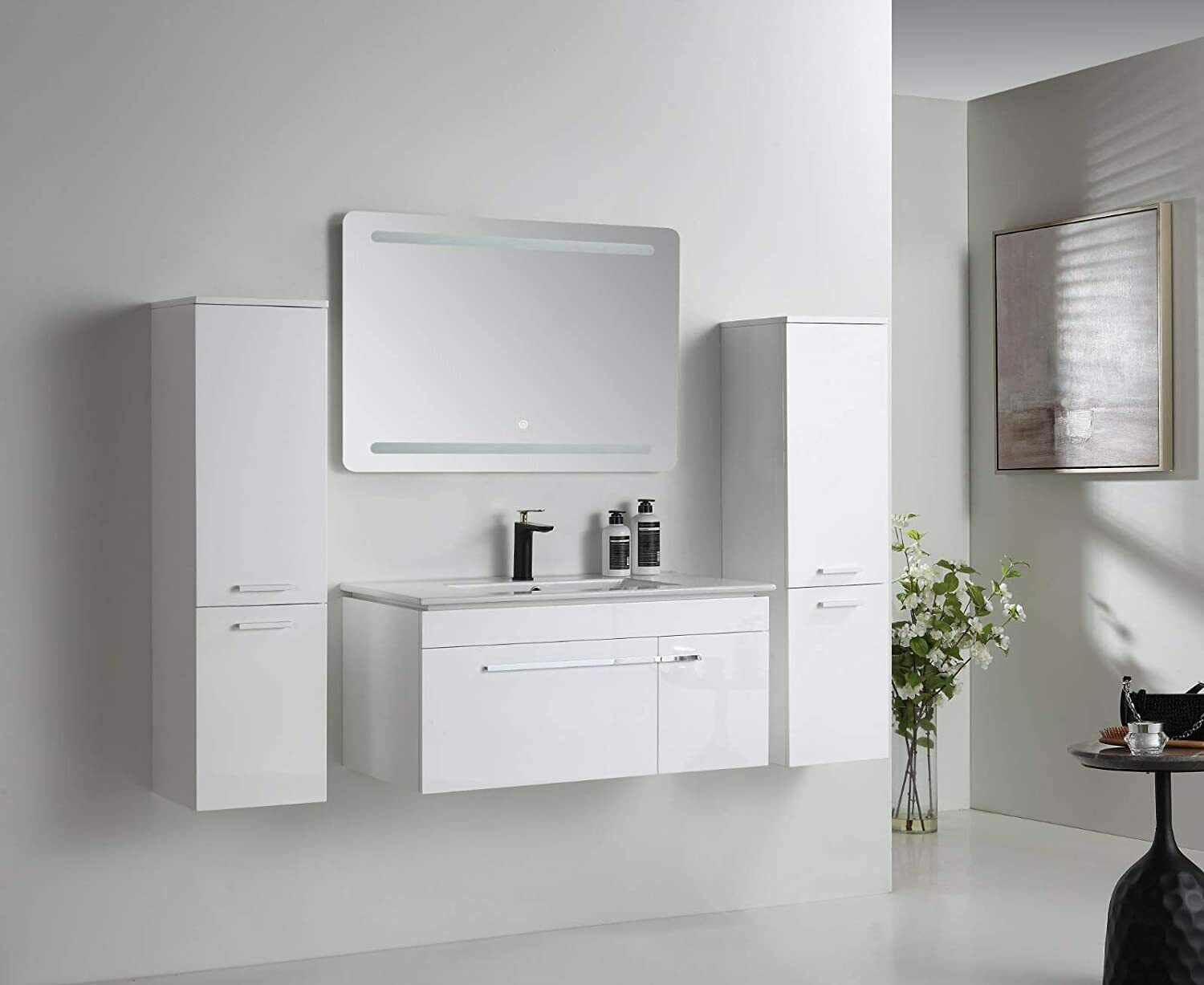 5-tlg Badmöbel Set – 90 cm Weiß Hochglanz mit LED Spiegel