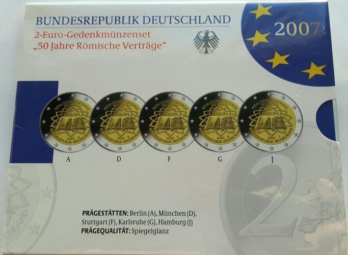 5 x 2 Euro Gedenkmünzen BRD 2007 "50 Jahre Römische Verträge" A-J, PP, OVP