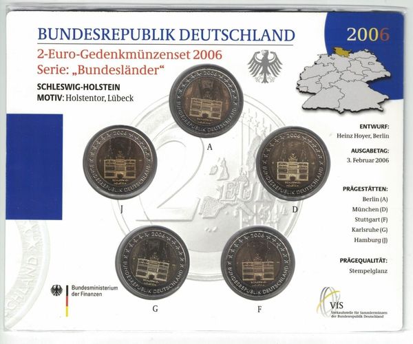 Sammlungsauflösung: BUNDESREPUBLIK DEUTSCHLAND 5 x 2-Euro-Sammlermünzen BRD 2006 Länderserie SchleswigHolstein Holstentor, Lübeck Prägestätten: A Berlin D München F Stuttgart G Karlsruhe J Hamburg Prägequalität: Stempelglanz Durchmesser: je 25,75 mm Prägejahr: 2006 Neu und OVP im Blister Versand per