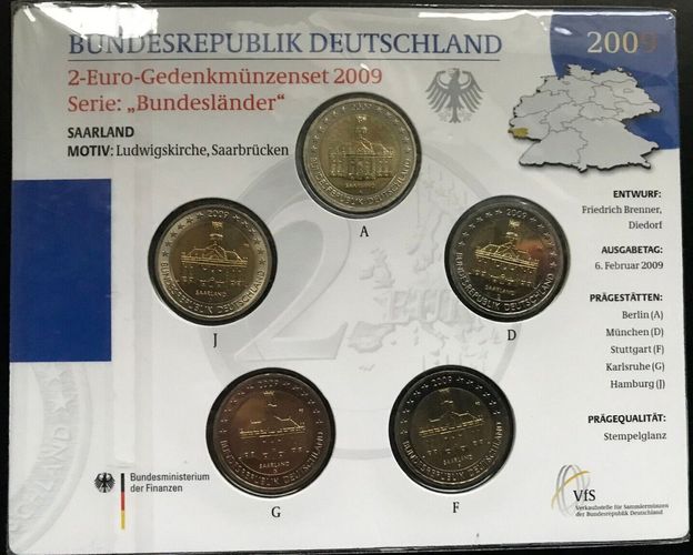 Sammlungsauflösung: BUNDESREPUBLIK DEUTSCHLAND 5 x 2-Euro-Sammlermünzen BRD 2009 Länderserie Saarland Ludwigskirche, Saarbrücken Prägestätten: A Berlin D München F Stuttgart G Karlsruhe J Hamburg Prägequalität: Stempelglanz Durchmesser: je 25,75 mm Prägejahr: 2009 Neu und OVP im Blister Versand per