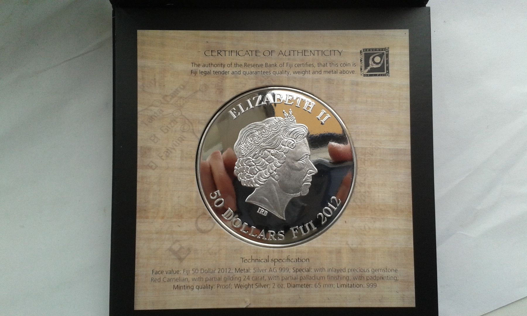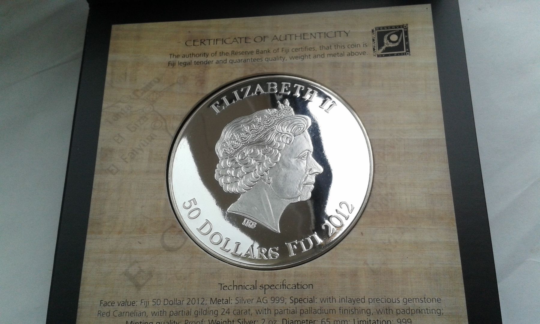 50 Dollars 2012 Fiji Ägypthen Tutanchamun 2 Unzen Silber fein mit Gold Palladium gilded - 999 Stück Auflage. Original verpackt im Schweberahmen. PP (proof) Prägung. Besteuerung gemäss UstG$25a. bei Fragen: