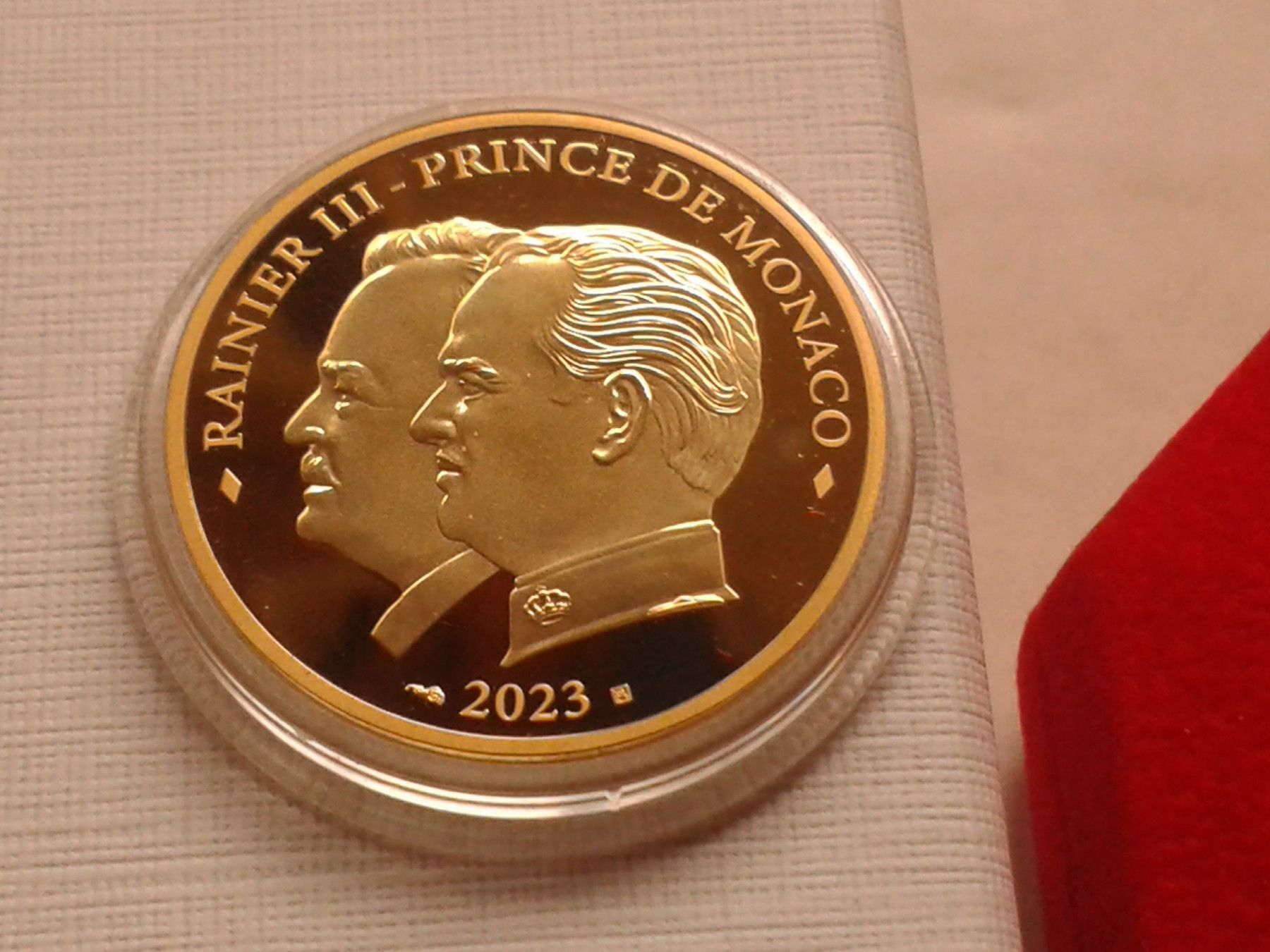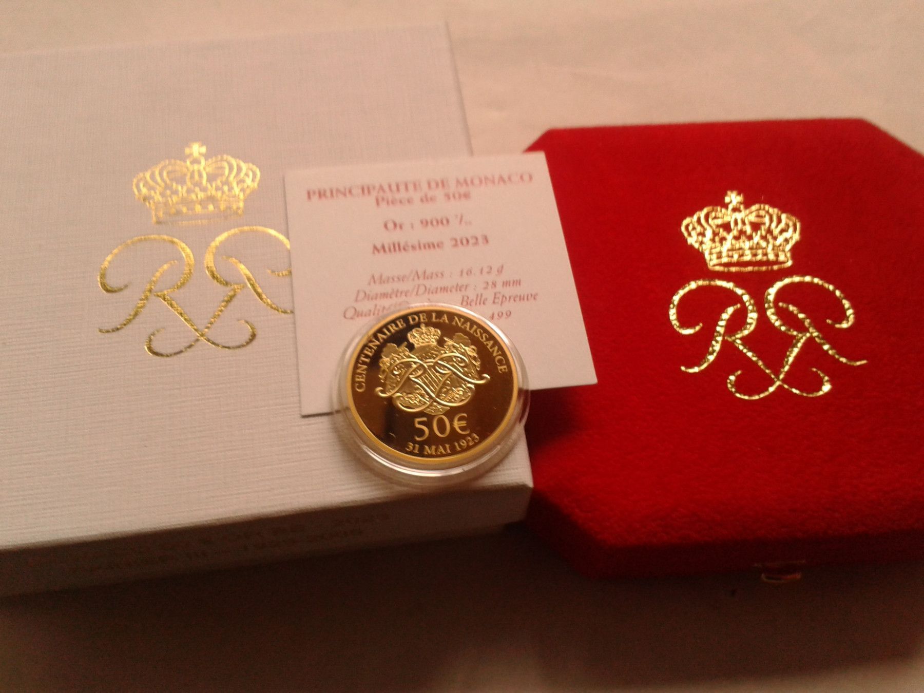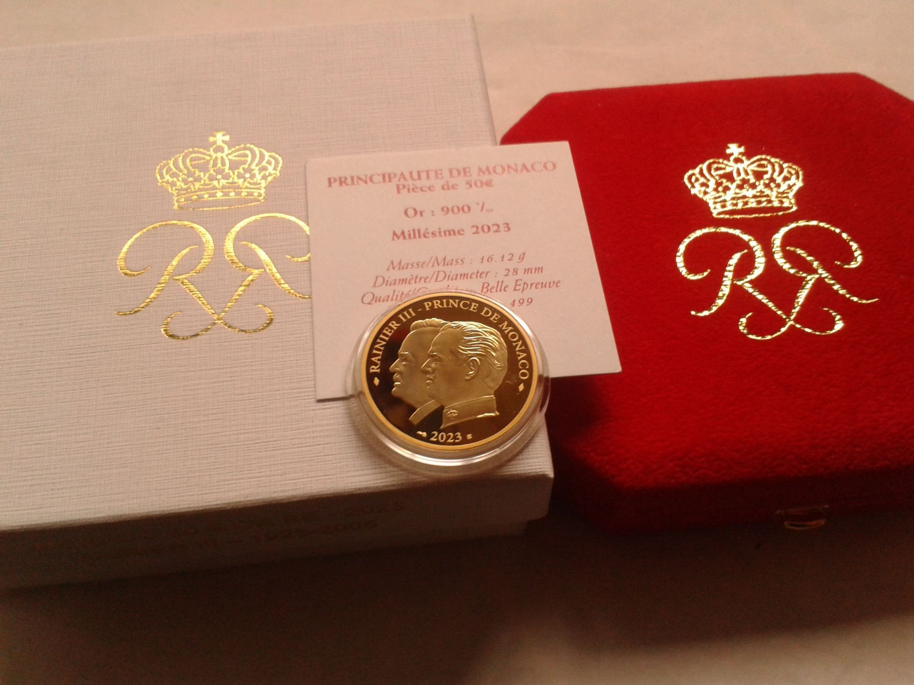 original verpackt, mit Etui, Zertifikat und Umverpackung; alles in bester Erhaltung 50 euro 2023 PP Monaco Fürst Albert II Rainier III. von Monaco 16,12g Gold 900er, nur 499 Exemplare geprägt bei Fragen: