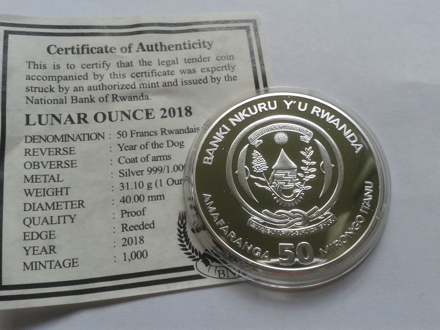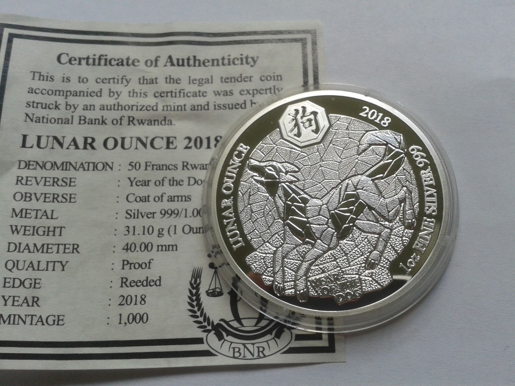 50 Francs 2018 PP Ruanda Hund Lunar 1 Unze Silber mit Zertifikat 50 Francs 2018 PP