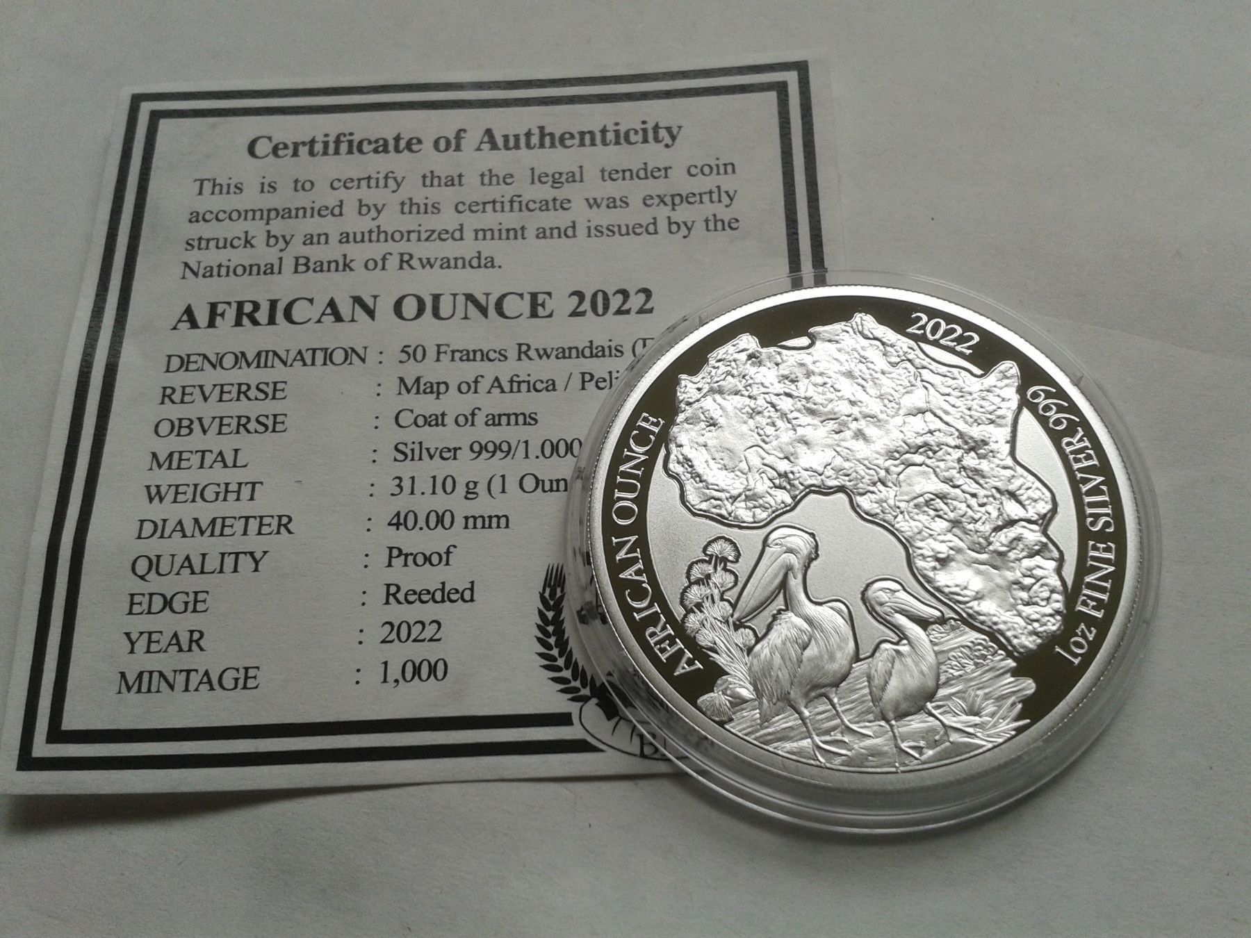 50 Francs 2022 PP Ruanda Pelikan 1 Unze Silber mit Zertifikat 50 FRW 2022 PP Ruanda