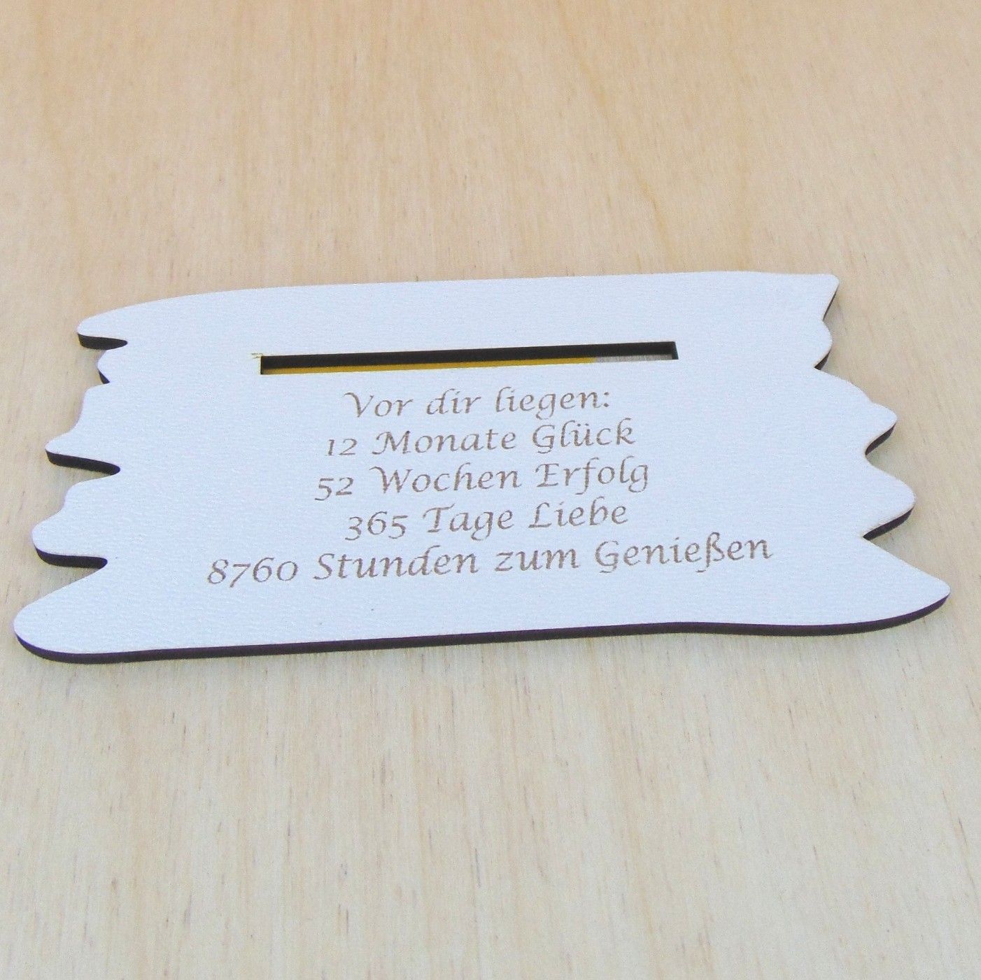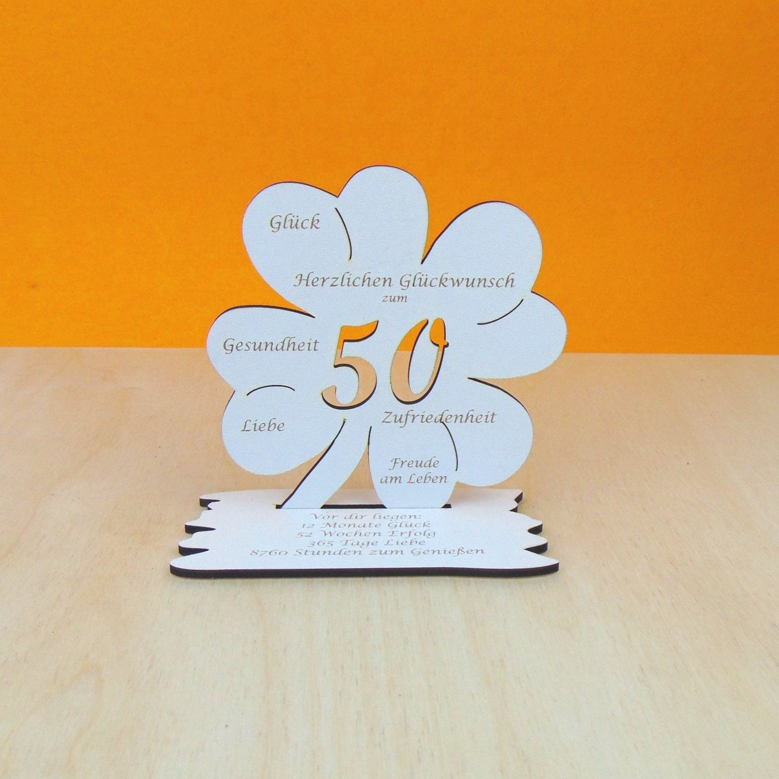 50. Geburtstag Gutscheingeschenk als Kleeblatt in 11 cm im Vintage Style, Weiß. Ein Halter auf der Rückseite dient für einen Gutschein oder ihr Geldscheine. Beidseitig in der Farbe: Vintage Weiß beschichtet mit Gravierten Text. Vor dir liegen 12 Monate Glück 52 Wochen Erfolg 365 Tage liebe 8760 Stunden zum Genießen Unterplatte sind in 14 verschiedenen Sprüchen erhältlich, siehe Shop. Alle Geburtstagszahlen sind erhältlich. holzteilchen_diy