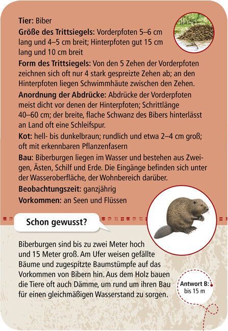 Spieleranzahl: 1 bis 2 Spieler Spieldauer: 15 Minuten Altersempfehlung: 6 + Expedition Natur - 50 heimische Tierspuren Ein echter Bestseller aus der Expedition Natur Reihe Welcher Baum wächst hier eigentlich im GartenEuro Welcher Vogel zwitschert morgens so frühEuro Und ist das eigentlich eine Wespe