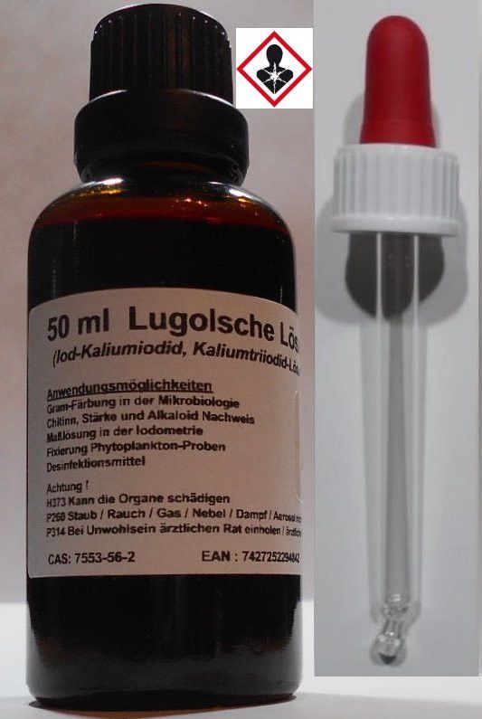 • 100 ml Lugolsche Lösung 5%ig (Iod-Kaliumiodid, Kaliumtriiodid-Lösung)