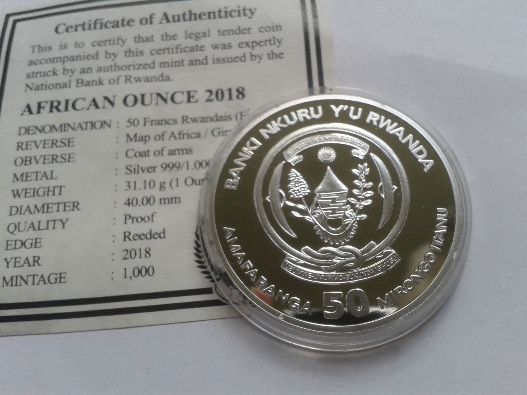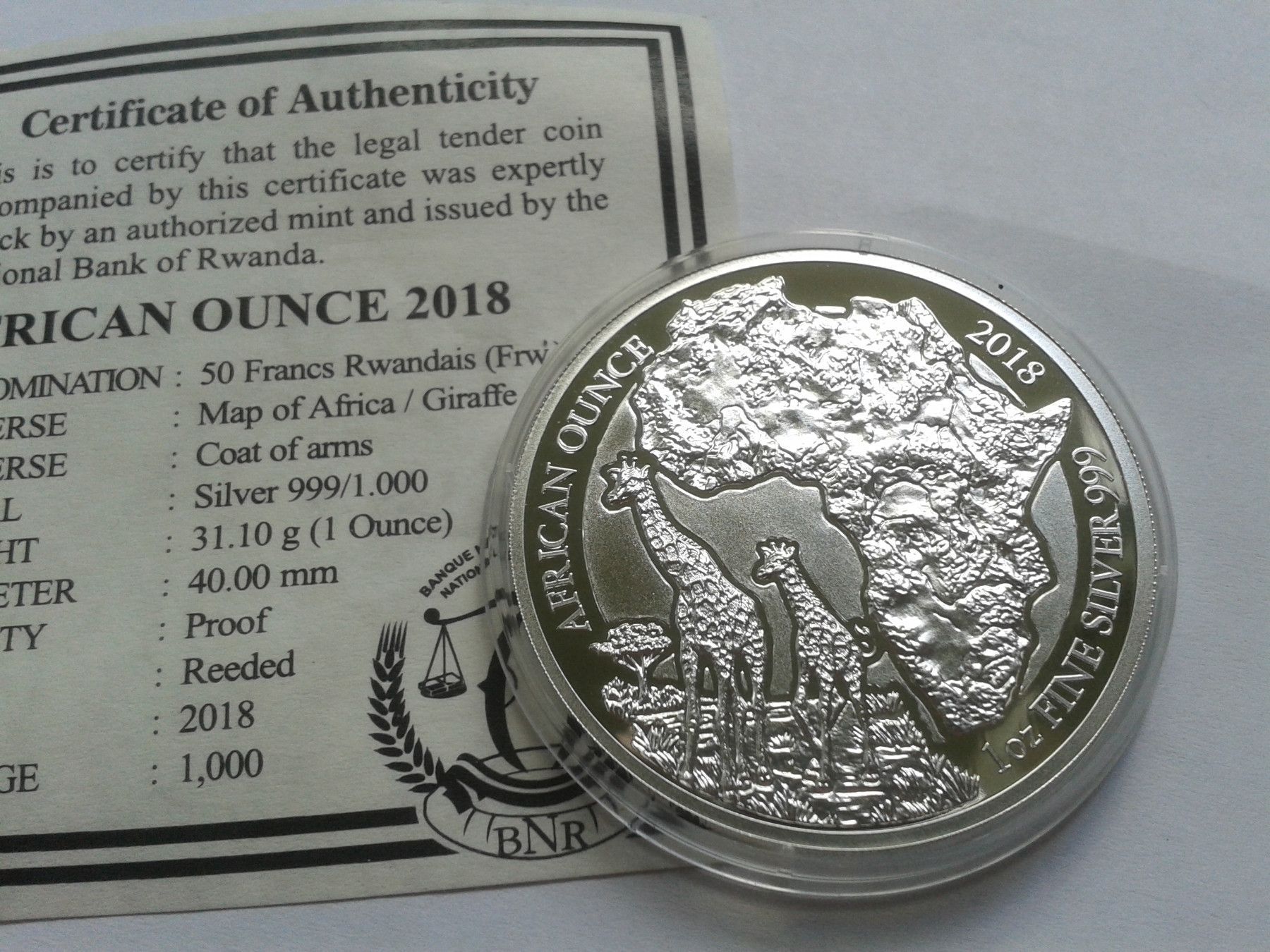 50 RWF 2018 PP Ruanda Giraffe 1 Unze Silber mit Zertifikat 50 Francs 2018 PP Ruanda
