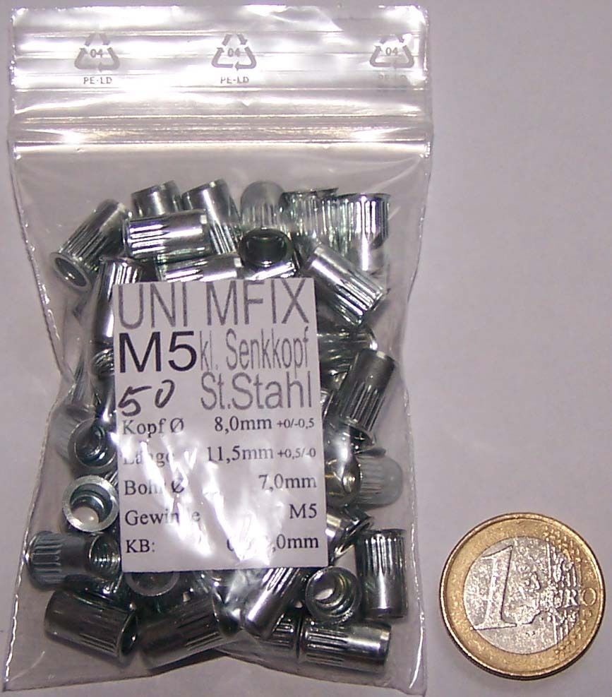 50 Stahl Blindnietmuttern M5 Mini Senkkopf gerändelt Einnietmutter Nietmutter