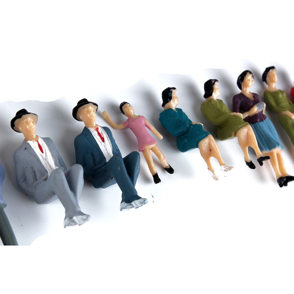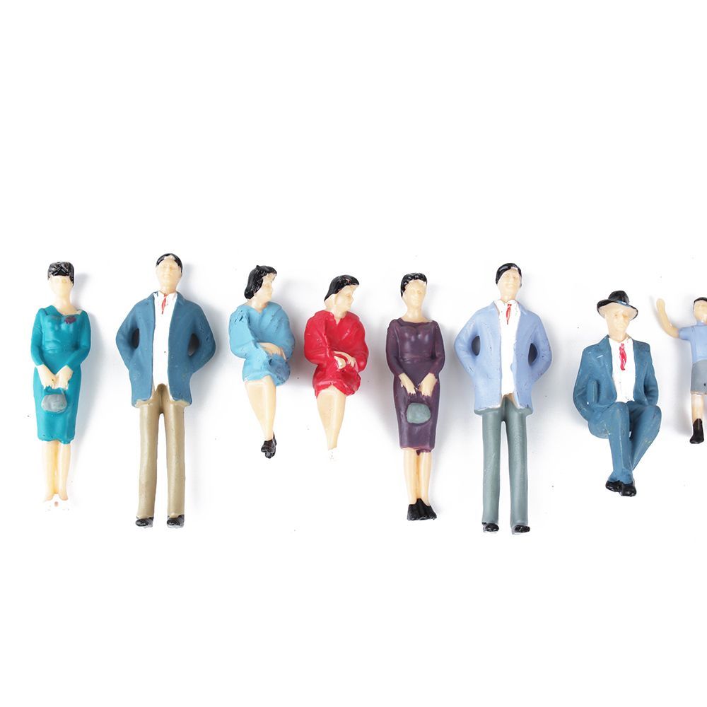 Unterschiedliche & zufällig gemischte Modellbau Figuren 1:32 in einem Set von 50 Stk. Stehende & sitzende Modellbau Figuren in einem gemischten Set-Angebot. Handbemalte Diorama Figuren welche sich bestens für die Spur 1 Modellbahn eignen.