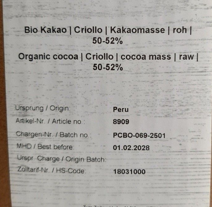 Bio Criollo Kakaomasse theobroma cacao in Rohkost Qualität aus Peru mit 50 - 52 % Kakaobutter DE-ÖKO-037 Nicht-EU-Land mindestens haltbar bis 01.02. 2028 250 g in Brockenform in unterschiedlichen Größen wie z.B. auf Foto 1 Die Kakaomasse wird nach Ihrem Kauf aus dem Kakaoblock (siehe Fotos 2 und 3)