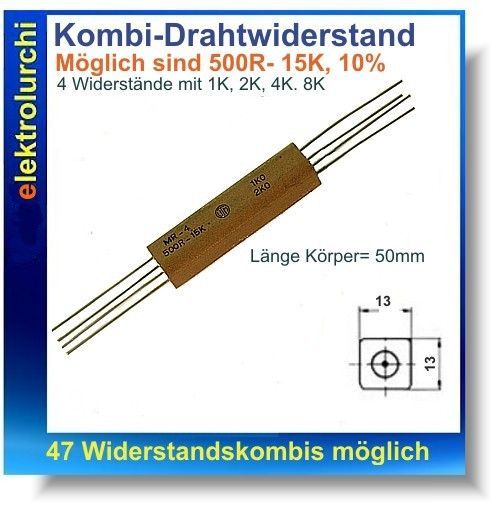 Sie bieten hier auf folgenden Artikel 1 Stück 500 Ohm - 15K Kombi-Widerstand 10W, 10%, Multi-Range 47 Kombi., Vitrohm MR-4 Dieser Kombi-Widerstand enthält insgesamt 4 Widerstände Die Werte sind 1kOhm, 2kOhm, 4kOhm, 8kOhm, alle Anschlüsse sind separat herausgeführt Durch Kombination (sprich Reihen- P