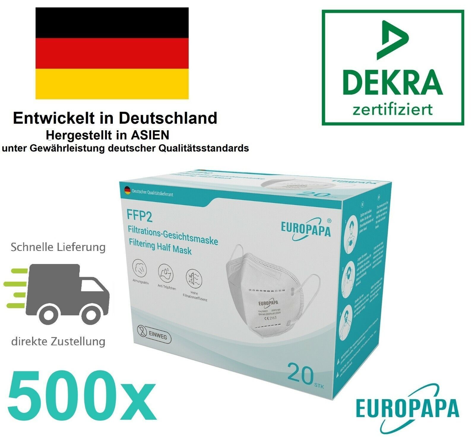 500 x FFP2 Atemschutzmaske DEKRA CE 2163 Maske FFP 2 Mundschutz Viren CE2163 NEU