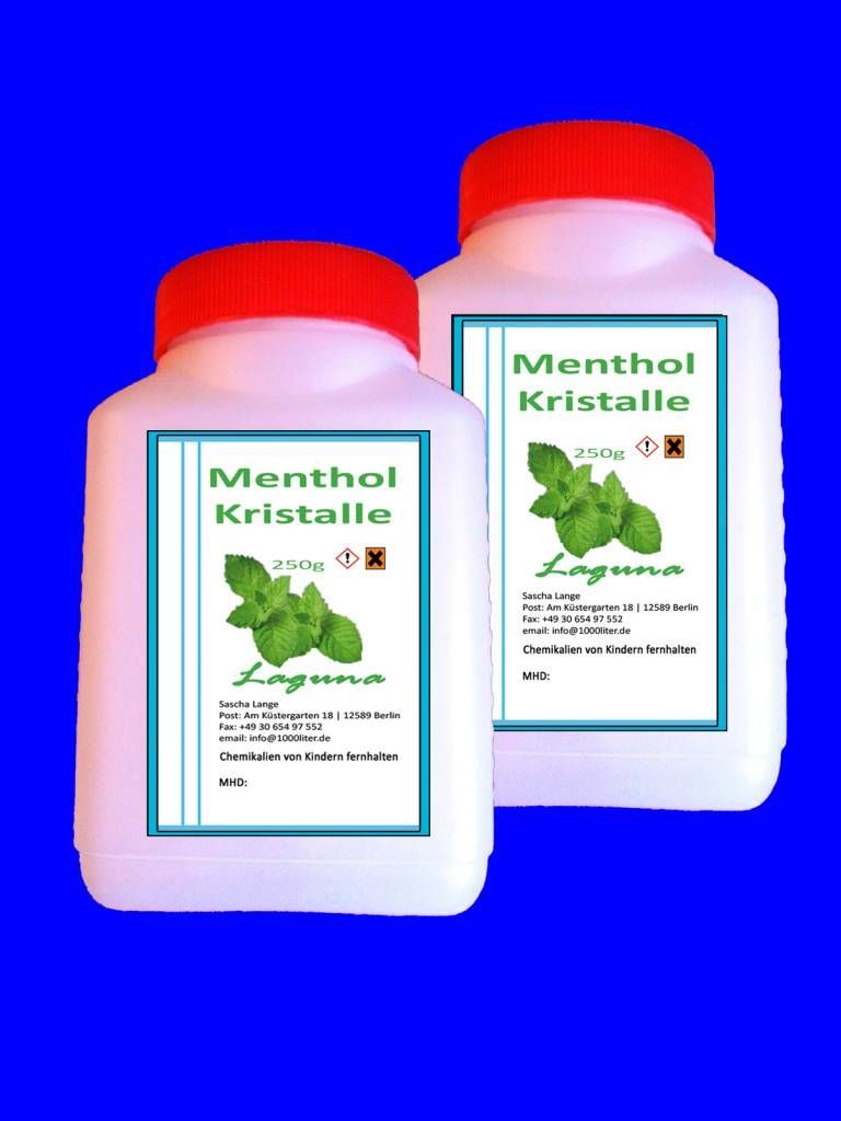 1 x500g Menthol-Kristalle 500 g Stoffname: L-Menthol - CAS-Nr.: 2216-51-5 - EG-Nr.: 218-690-9 Summenformel: C10H20O - Molmasse: 156,27 g mol Verwendung: Saunaduft Gefahrenhinweise H315 Verursacht Hautreizungen. H319 Verursacht schwere Augenreizung Sicherheitshinweise P101 Ist ärztlicher Rat erforder