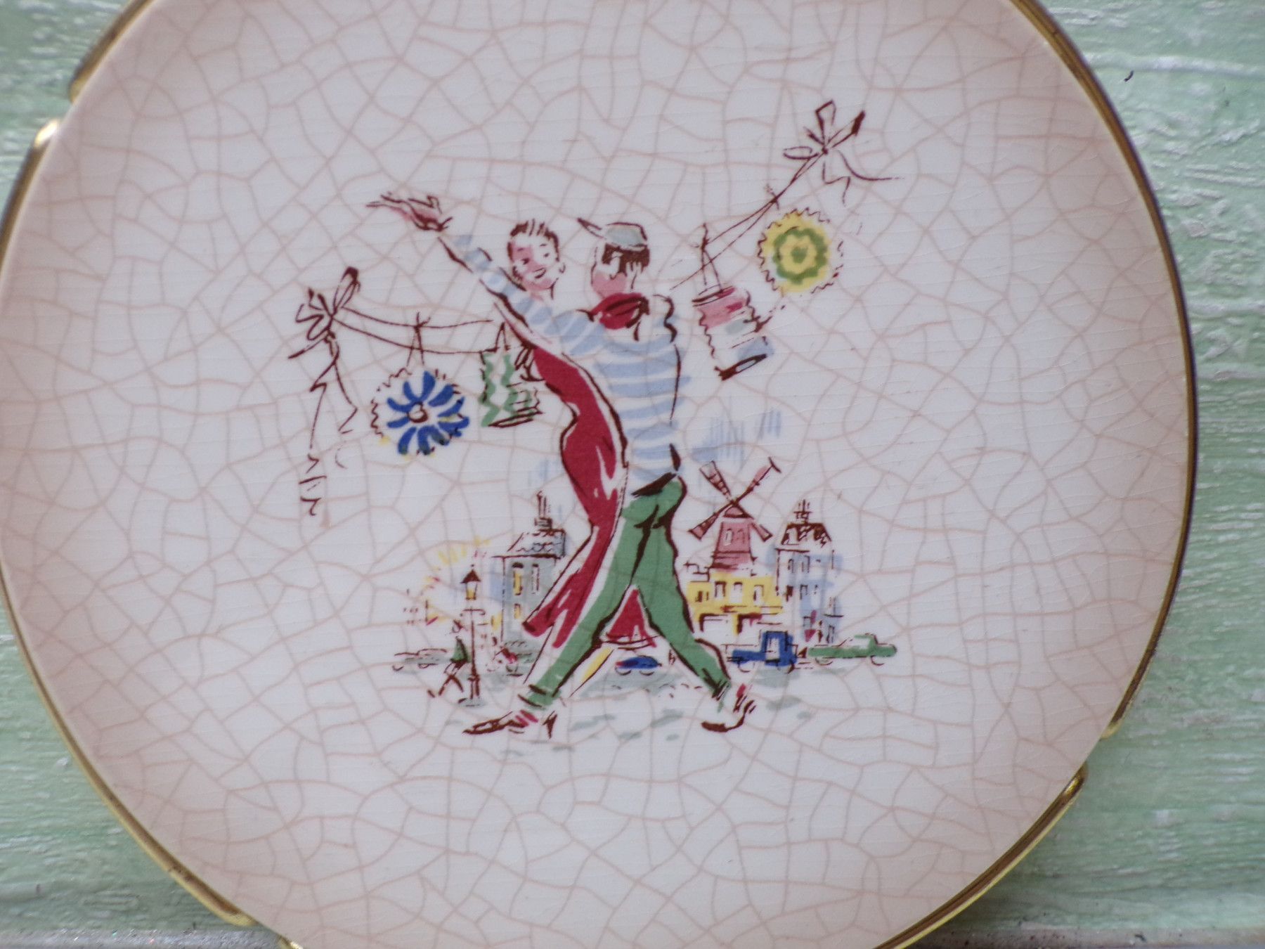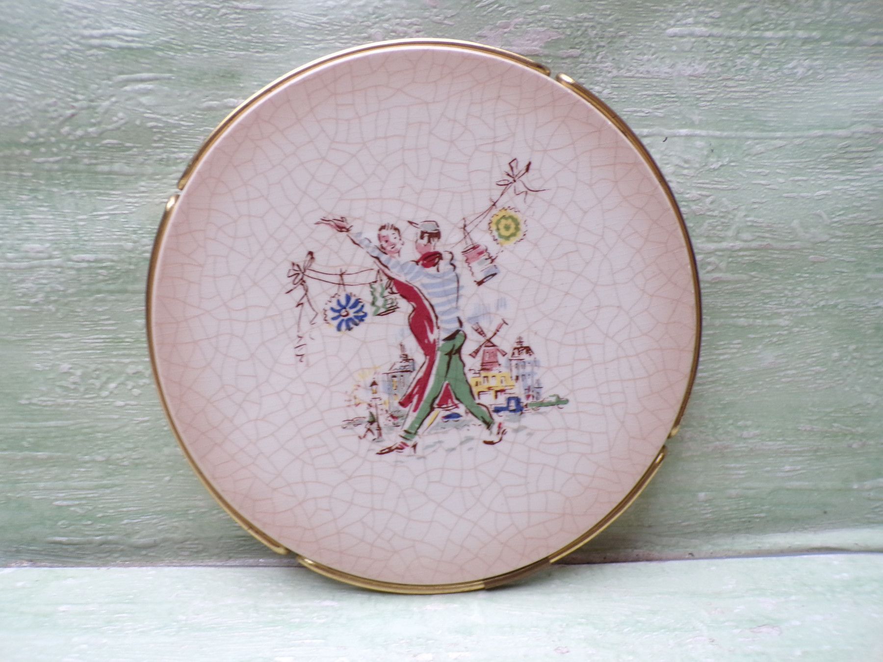 * * * Sammeln & Seltenes - Reklame & Werbung * * * * ... aus Freude an schönen Dingen ..... . alter Keramikuntersetzer mit goldenem Metallgestell mit Füßchen ca 15,5cm im Durchmesser Craquele-Optik es zeigt ein Tanzpaar , vermutlich vor einer Pariser Kulisse . Zustand : sehr gut !!! ... bitt... Mehr