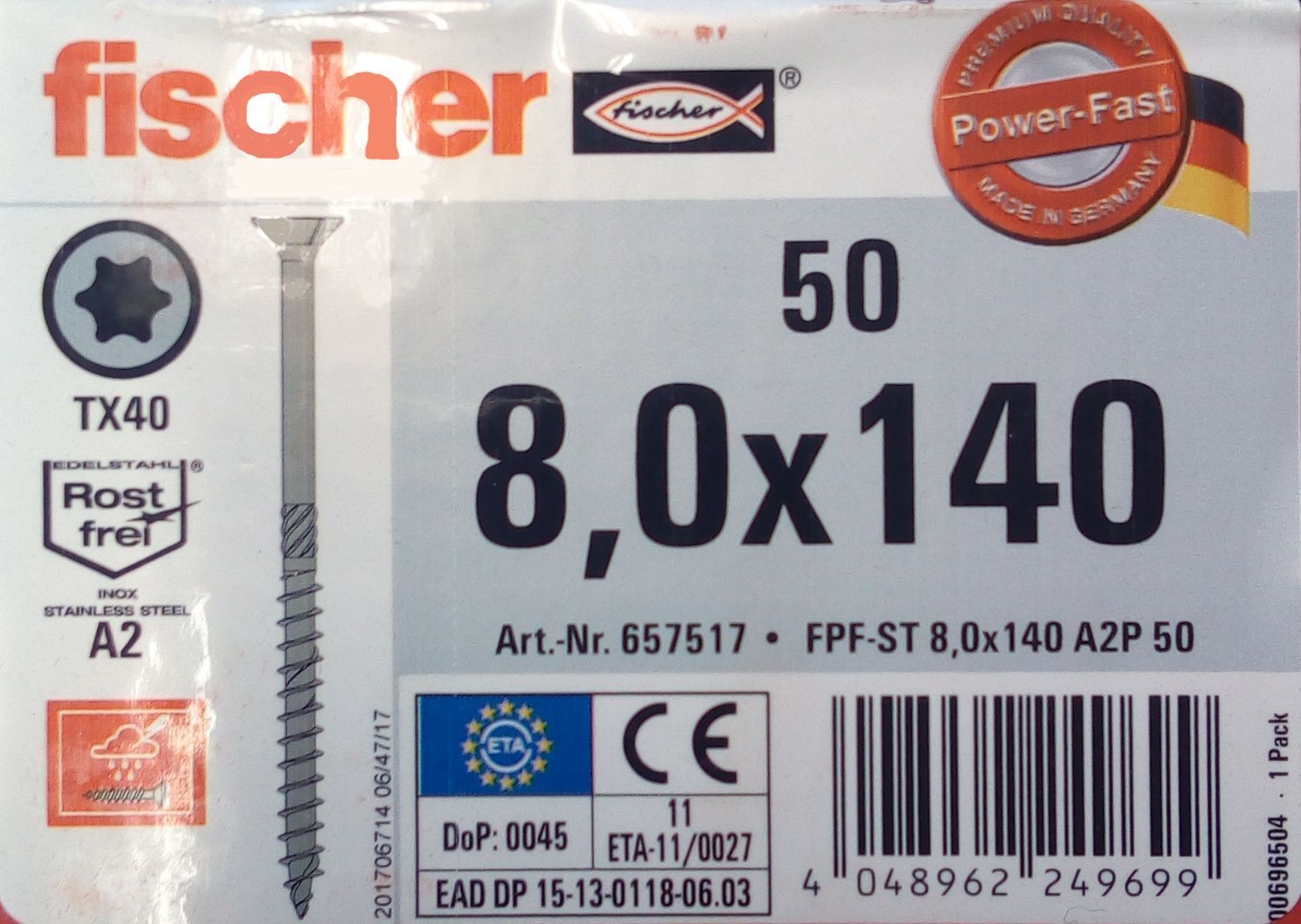 50x fischer Spanplattenschrauben 8,0x140 Power Fast A2 TX Senkkopf Teilgewinde