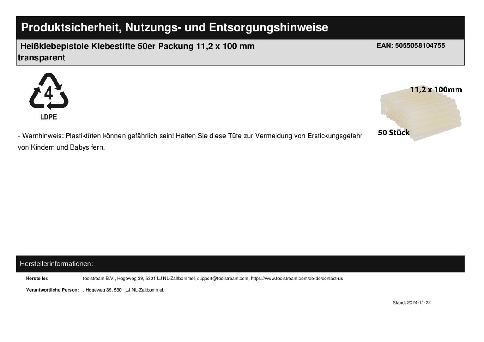 50x Klebestifte 11,2x100 mm für Heißklebepistole Sticks 50er Packung transparent