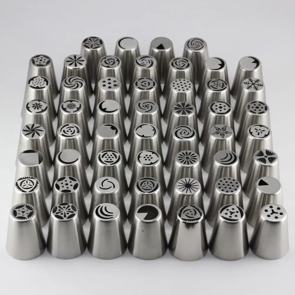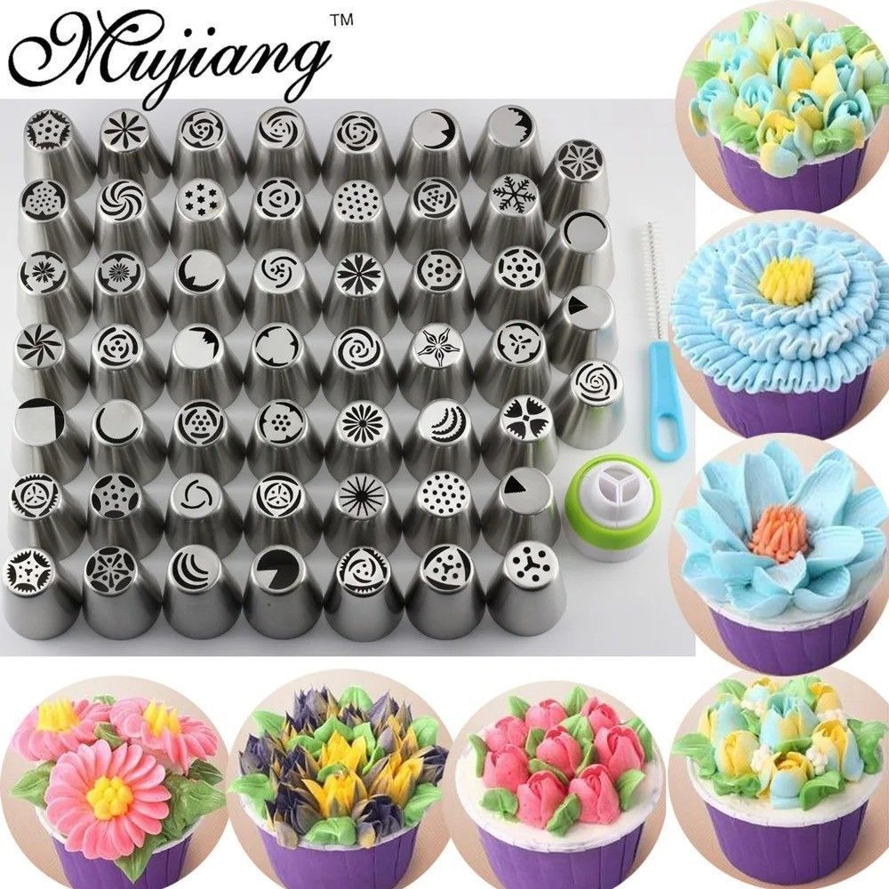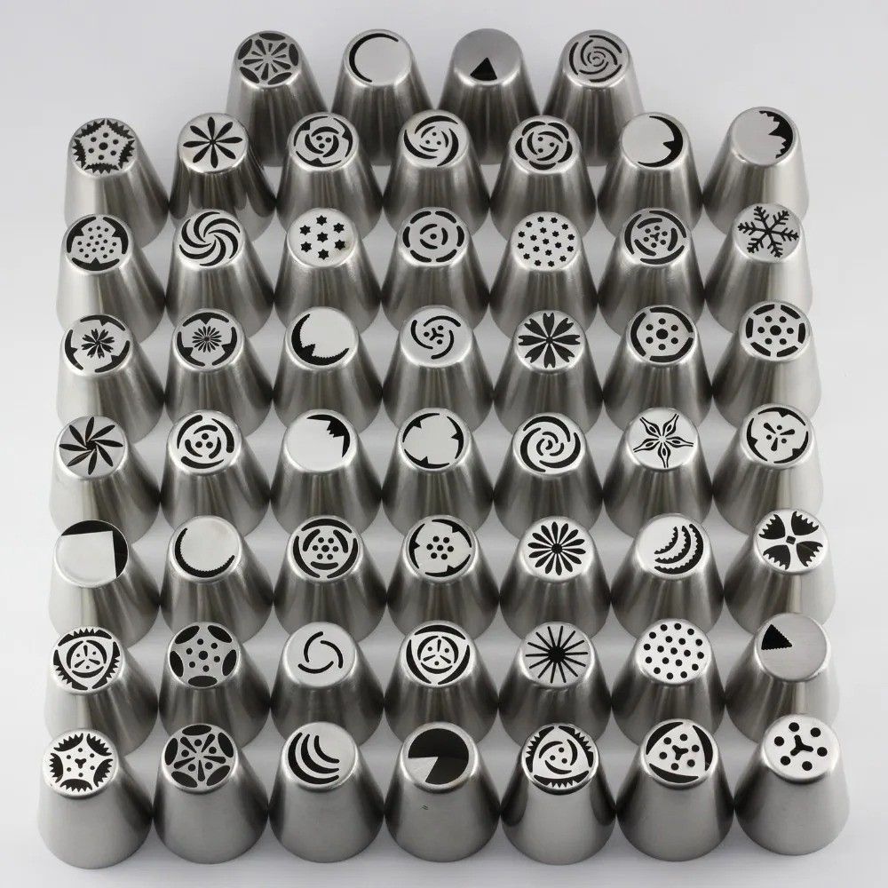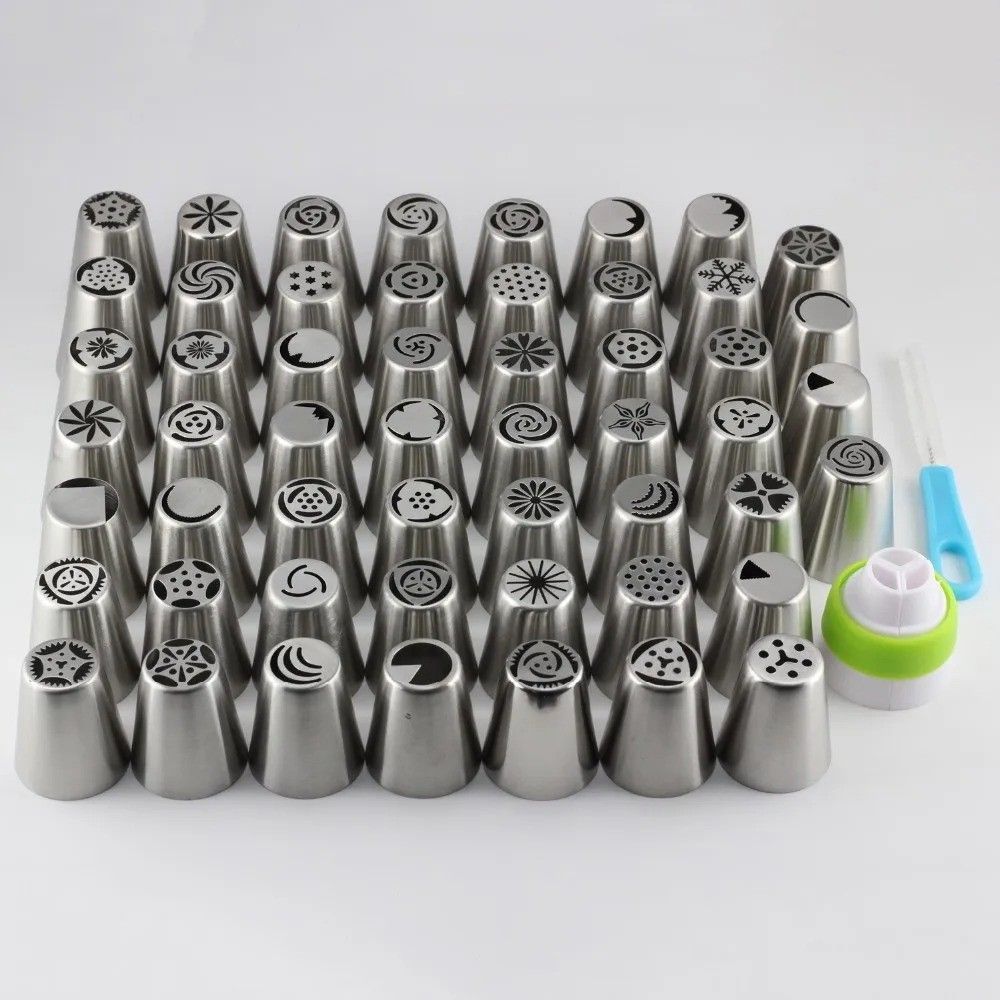 This comprehensive 55-piece set features stainless steel Russian tulip piping nozzles and pastry tips, designed for professional and home cake decorating. The nozzles are engineered to create intricate floral designs, particularly realistic tulips, and a wide variety of other patterns and borders. C