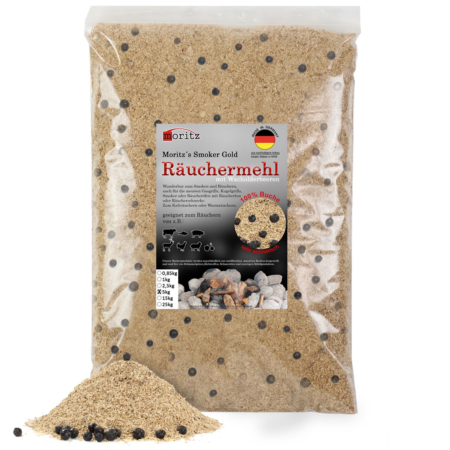 5kg Räuchermehl Buche mit Wacholder fein 0,5 -1 mm Kalt-/Heißräuchern Fisch Fleisch
