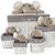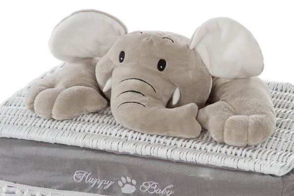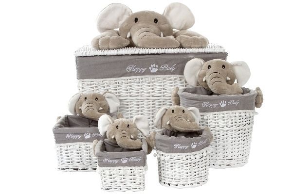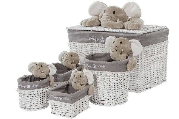 5tlg. Wäschekorbset Happy Elephant Weide&Stoff Weiß&Grau