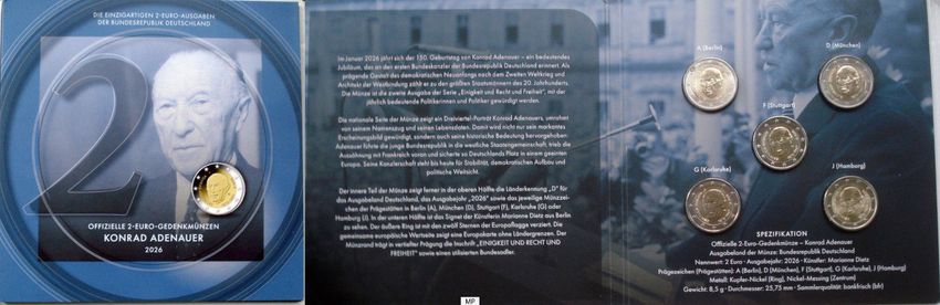 5x 2 € Euro Gedenk-Münzensatz KONRAD Adenauer MDM- ADFGJ