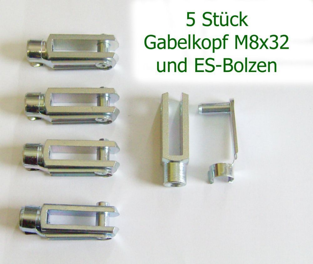 5 Stück Gabelköpfe M8x32 mit ES-Bolzen geliefert werden: 5x Gabelkopf + 5x ES-Bolzen