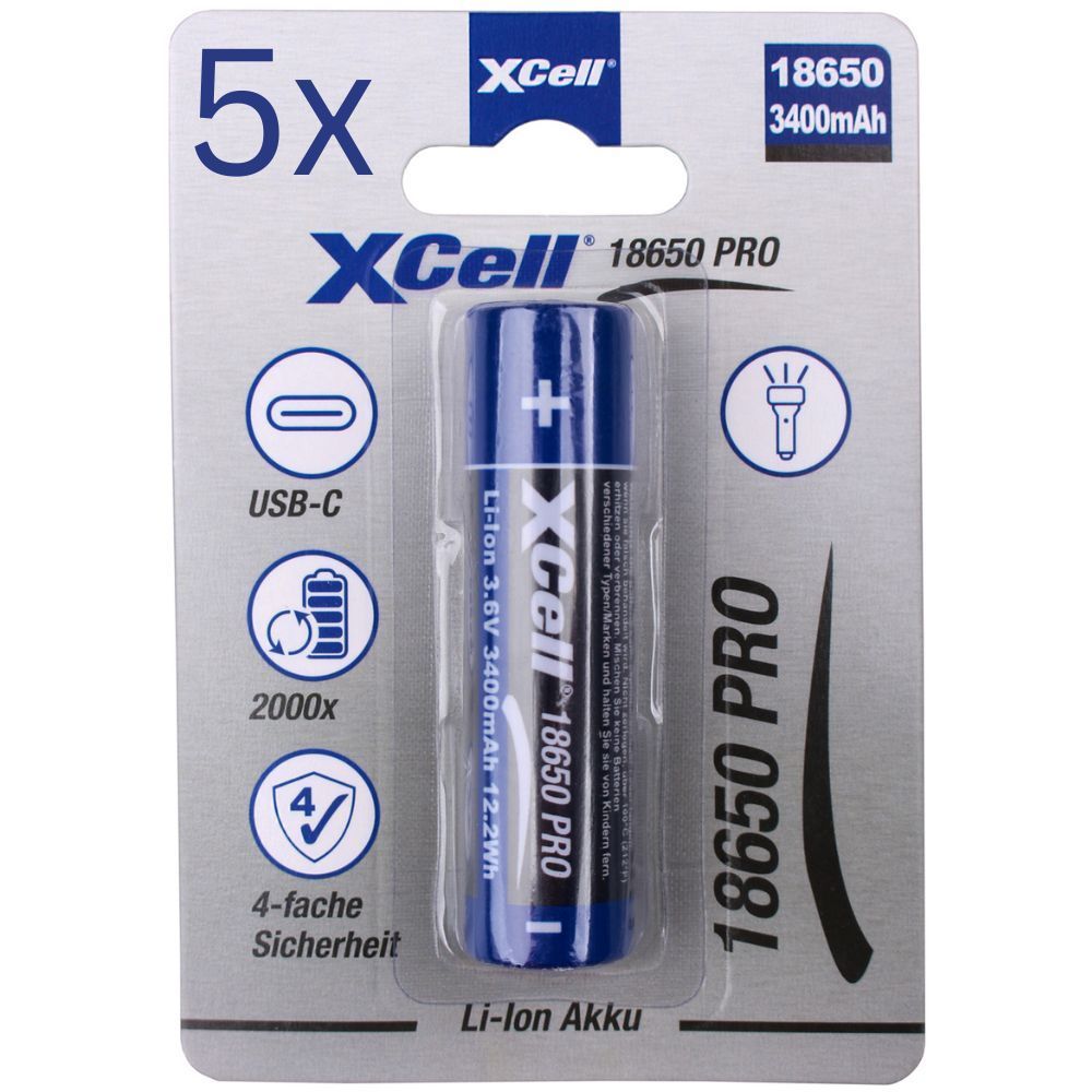 5x XCell 18650 Pro Li-Ion Akku 3,6V 3400mAh mit USB-C