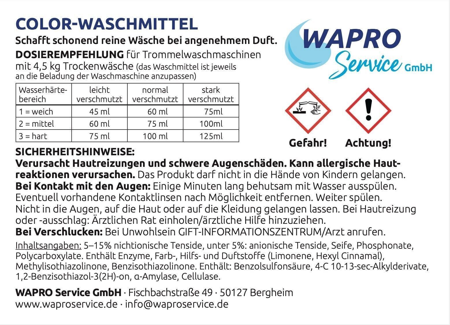 Color Waschmittel Gel 5x5 Liter Spezialwaschmittel für alles Bunte und Schwarze, schont die Fasern. Schafft schonend reine Wäsche bei angenehmen Duft. Ideal für die alltägliche Wäsche von jedem privaten Haushalt. Schützt die Farbe und die Fasern! Für Temperaturen von 30°C bis 60°C und alle Wasserhärtebereiche. Sie benötigen 8-22 ml/ kg Trockenwäsche. Abhängig vom Grad der Verschmutzung und Wasserhärte Grad.