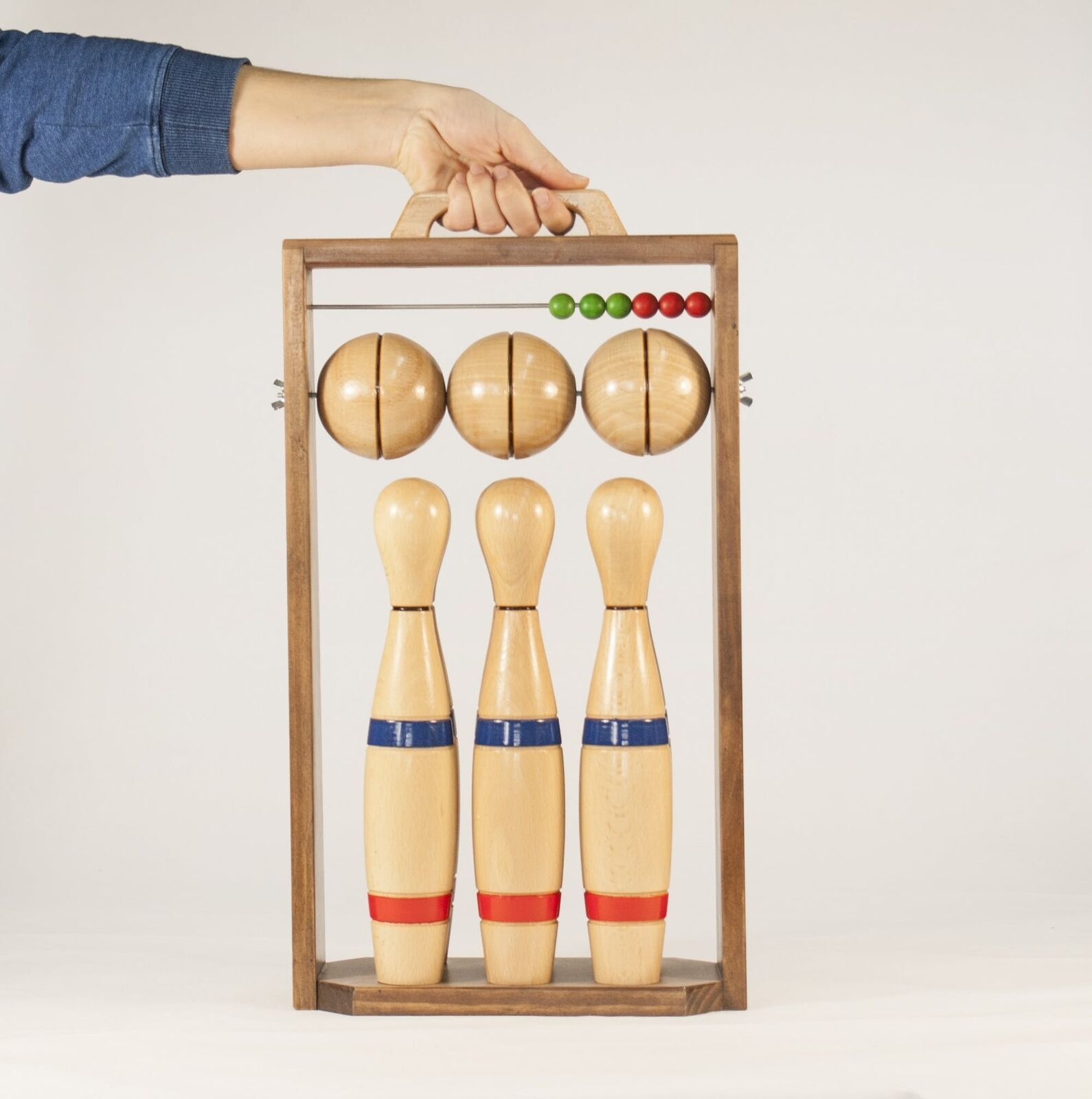 6 Holzkegel 30 cm hoch, Kegelspiel: Große Kegel und 3 Kugeln aus Holz, Bowling