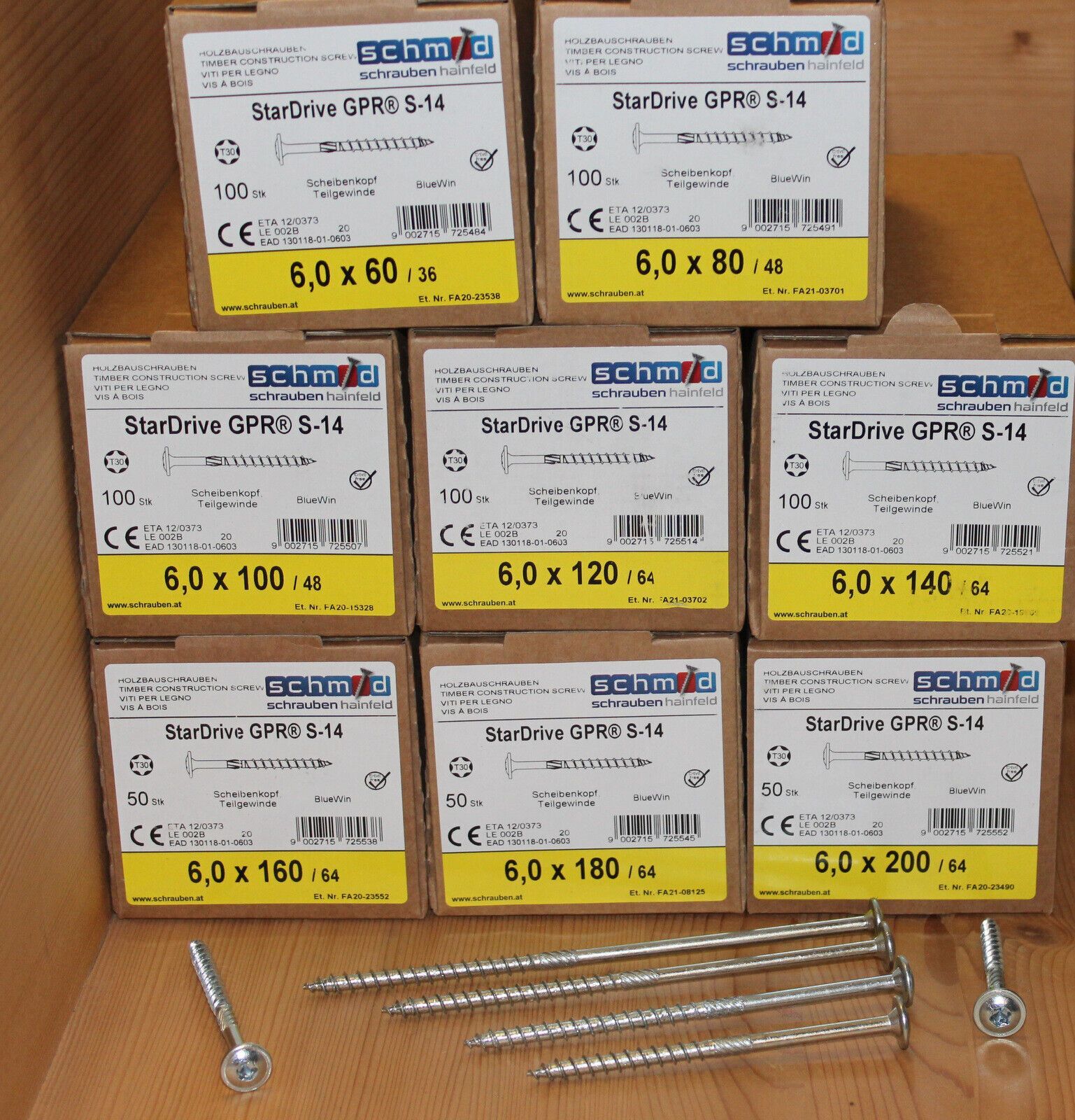 GPR® S-14 Tellerkopfschrauben 6,0 mm Torx Ein erstklassiges Produkt von Schmid Schrauben aus Österreich Mit EU-Zulassung ETA-12 0373 als Holzverbindungsmittel Galvanisch hell verzinkt, Teilgewinde Tellerkopf ( 14 mm ), kopfverstärkt Antrieb Torx TX 30 Grobganggewinde inklusive Mitgewinde, ausgew