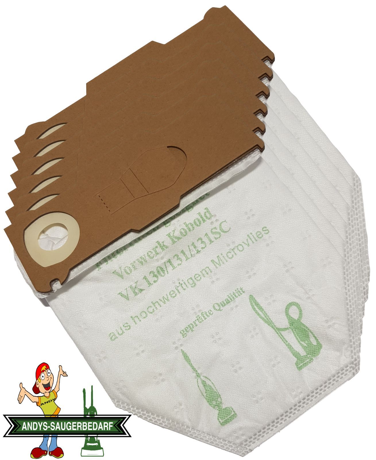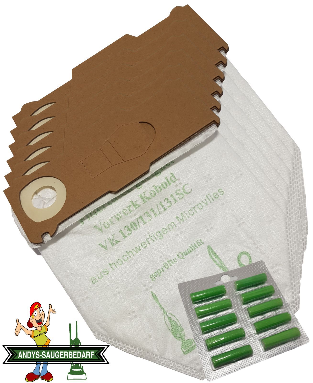 Andys-Saugerbedarf 6 Staubsaugerbeutel Vlies geeignet Vorwerk Kobold VK 130 131 + 10 Duft Artikelbeschreibung Sie erwerben 6 Staubsaugerbeutel. 4 lagiges Microvlies. Allergiker geeignet. Stabile Deckscheibe. Mit Staubverschluss. Im Polybeutel. + 10 Duftstäbchen Sommerwiese. Passend für den Vorwerk K