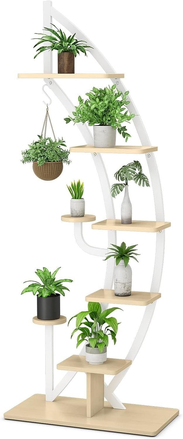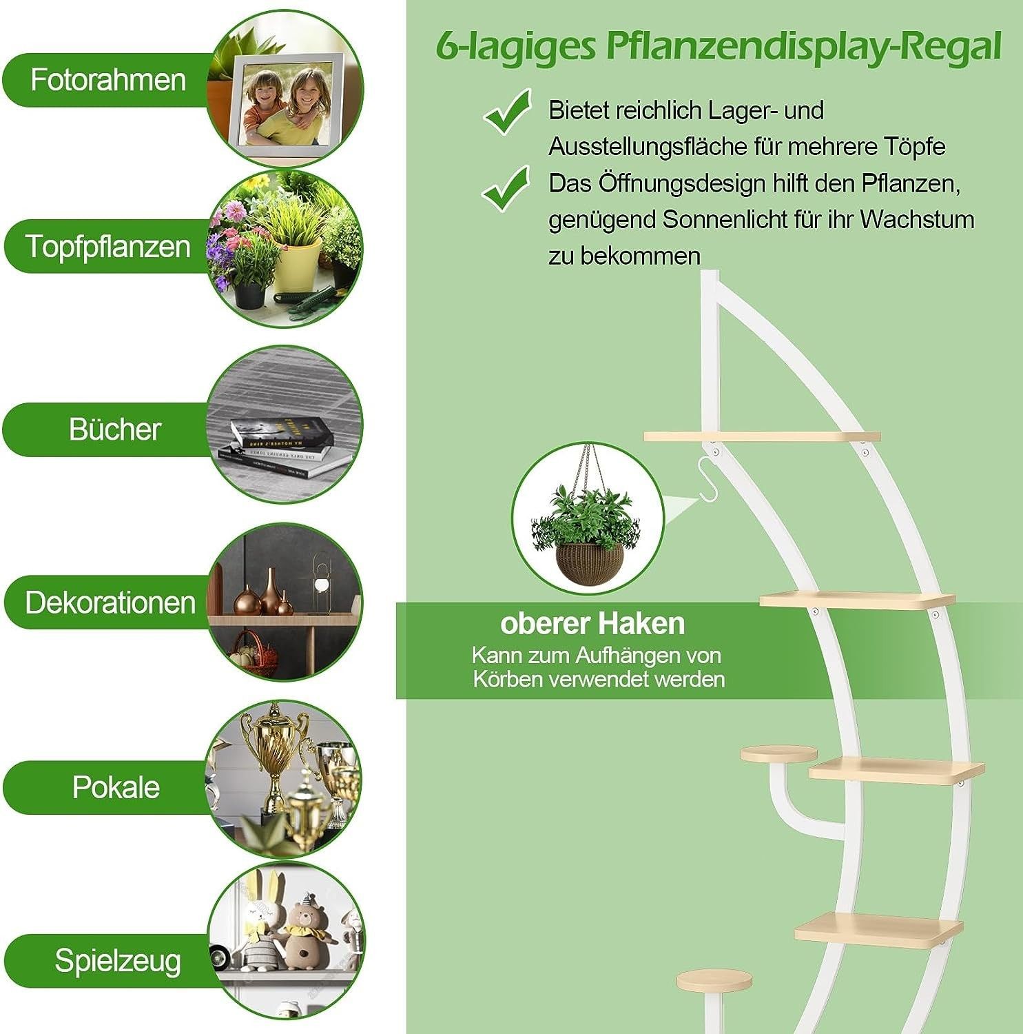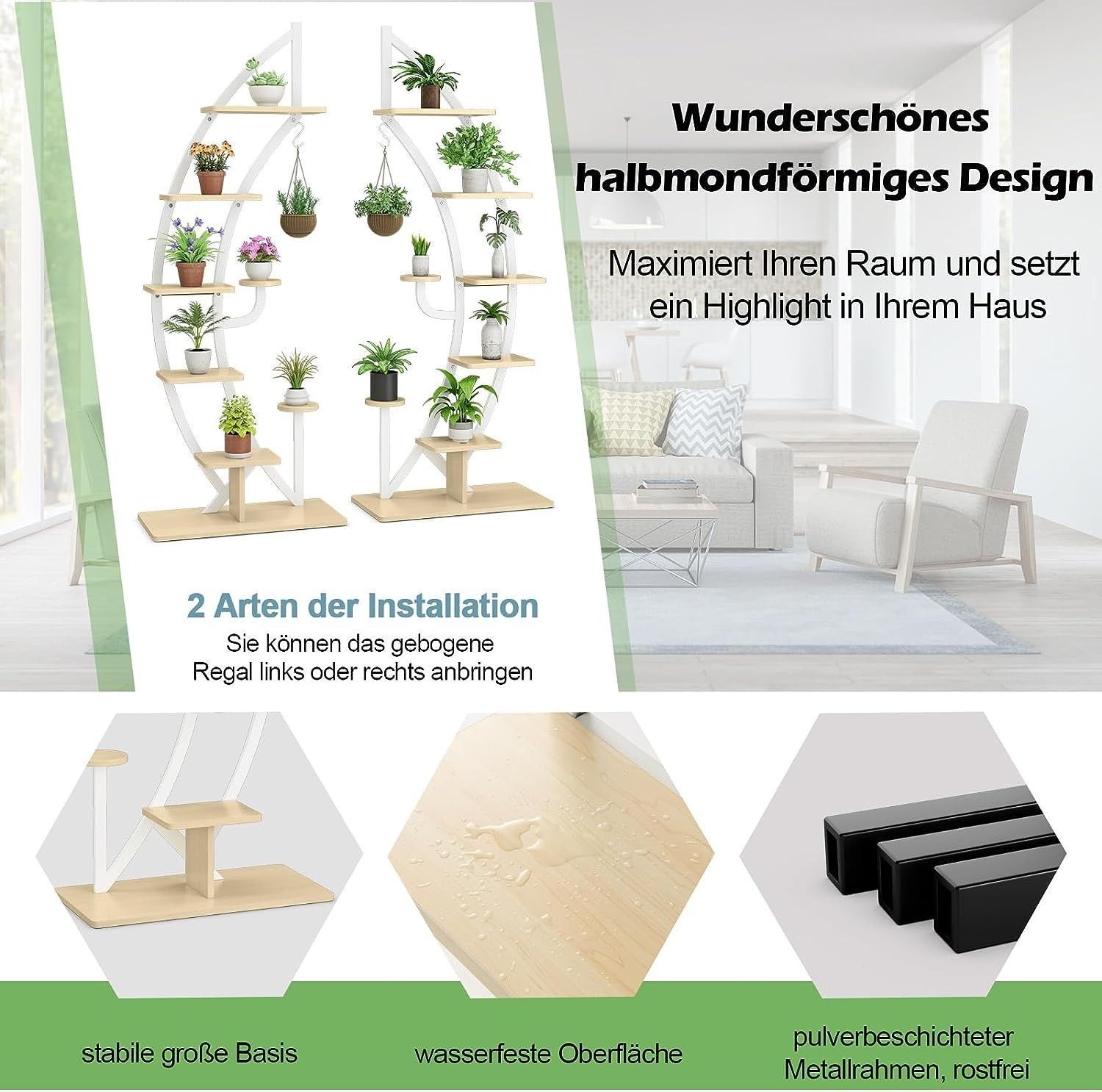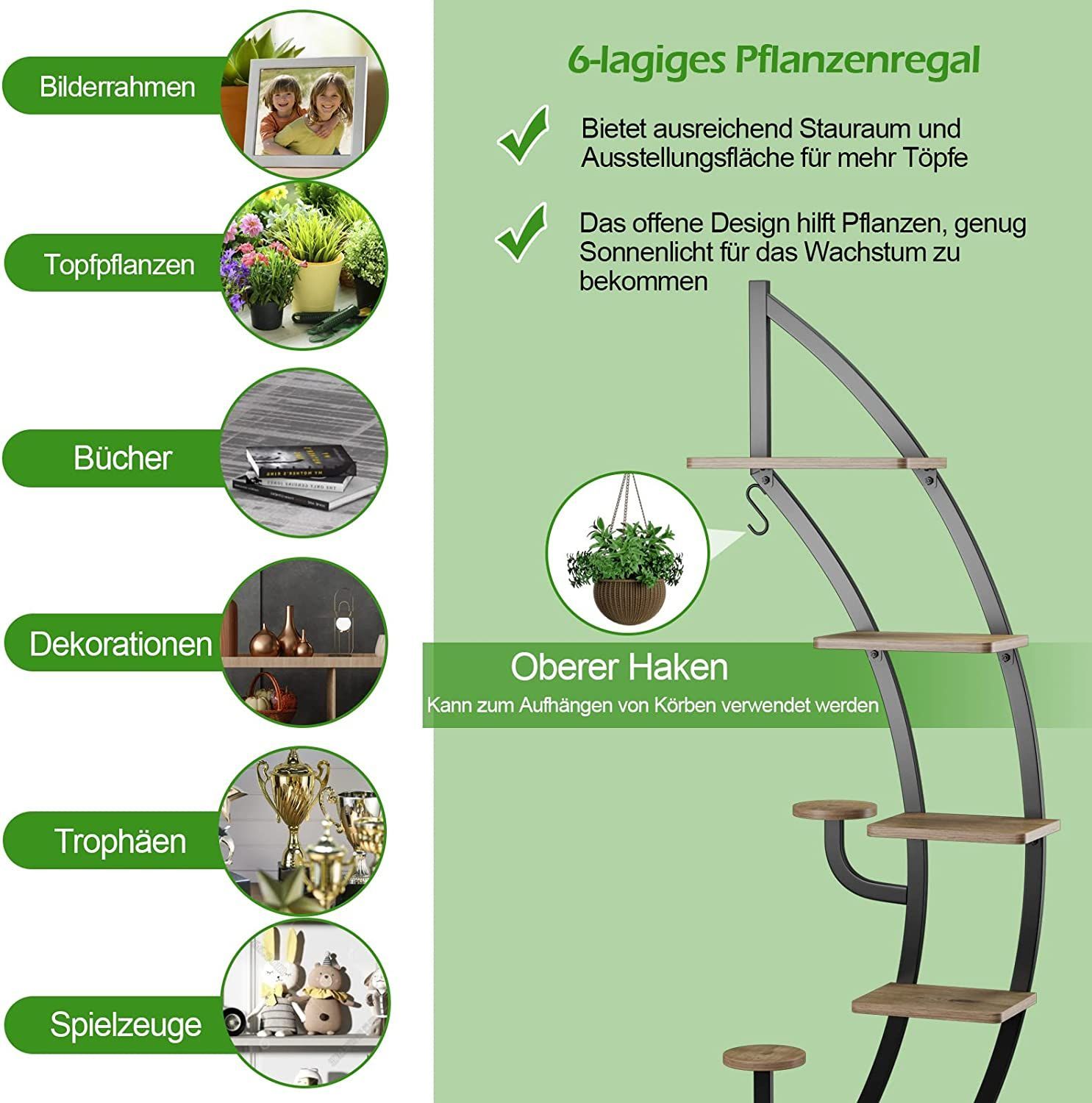 6-stufiger Metall-Pflanzenständer in Halbmondform, Blumenregal mit 2 kleine Ablagen