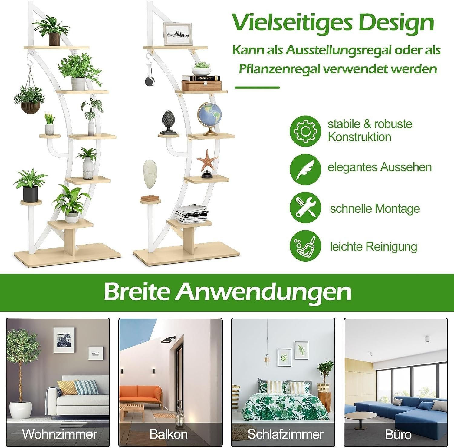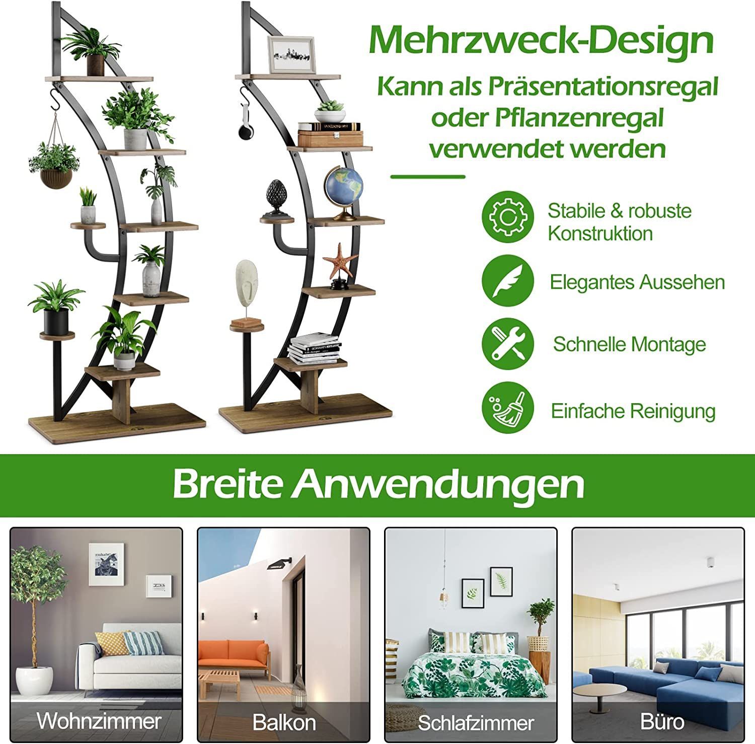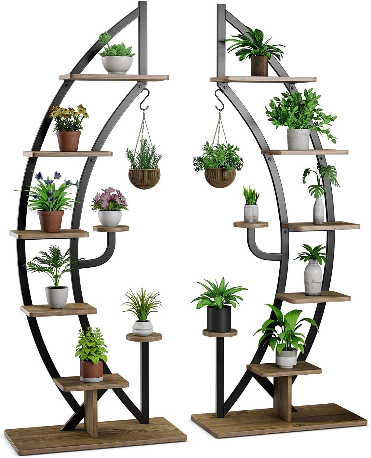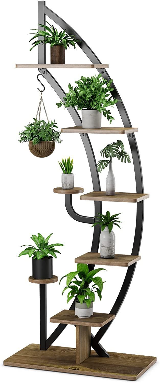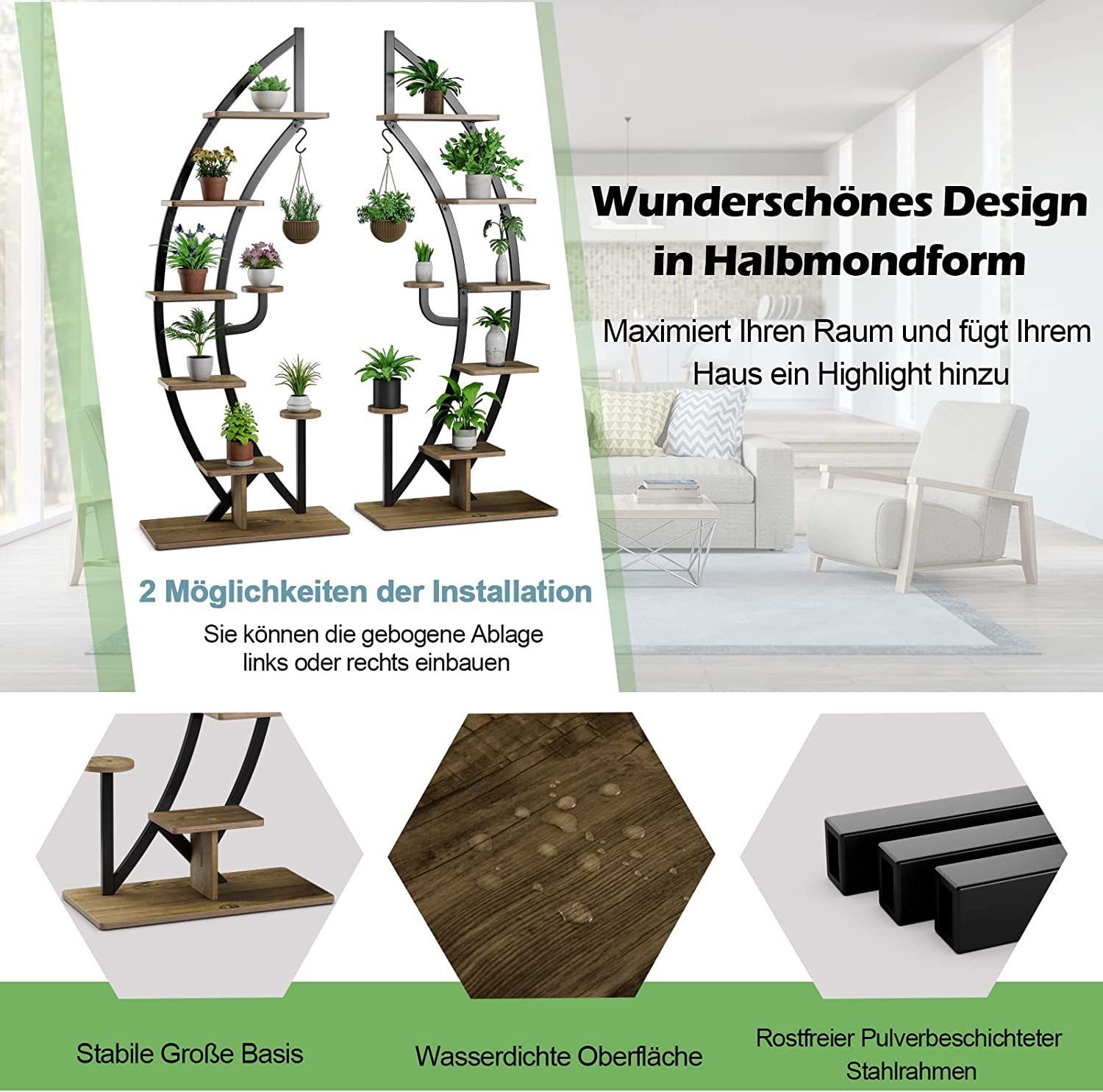 6-stufiger Metall-Pflanzenständer in Halbmondform, Blumenregal mit 2 kleine Ablagen