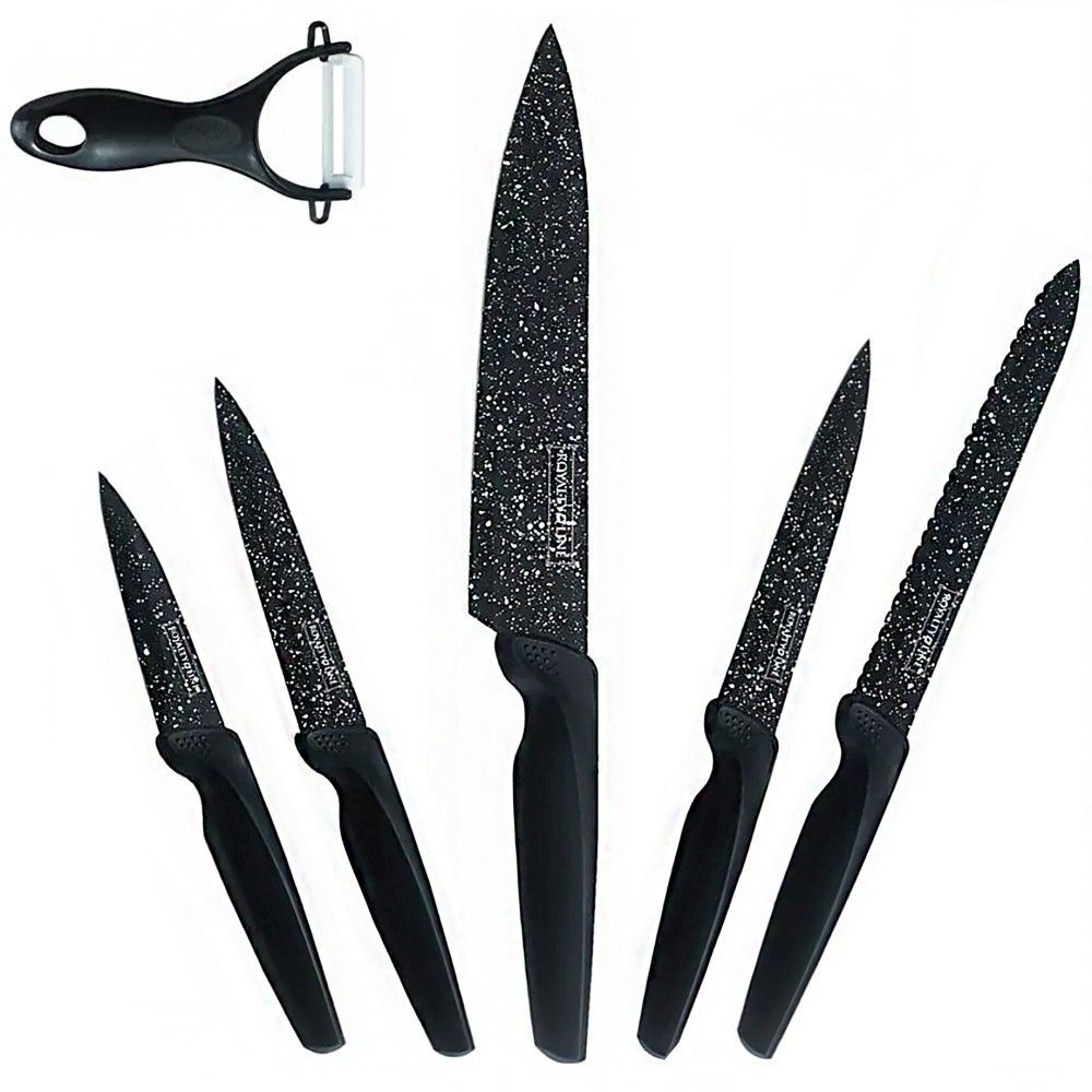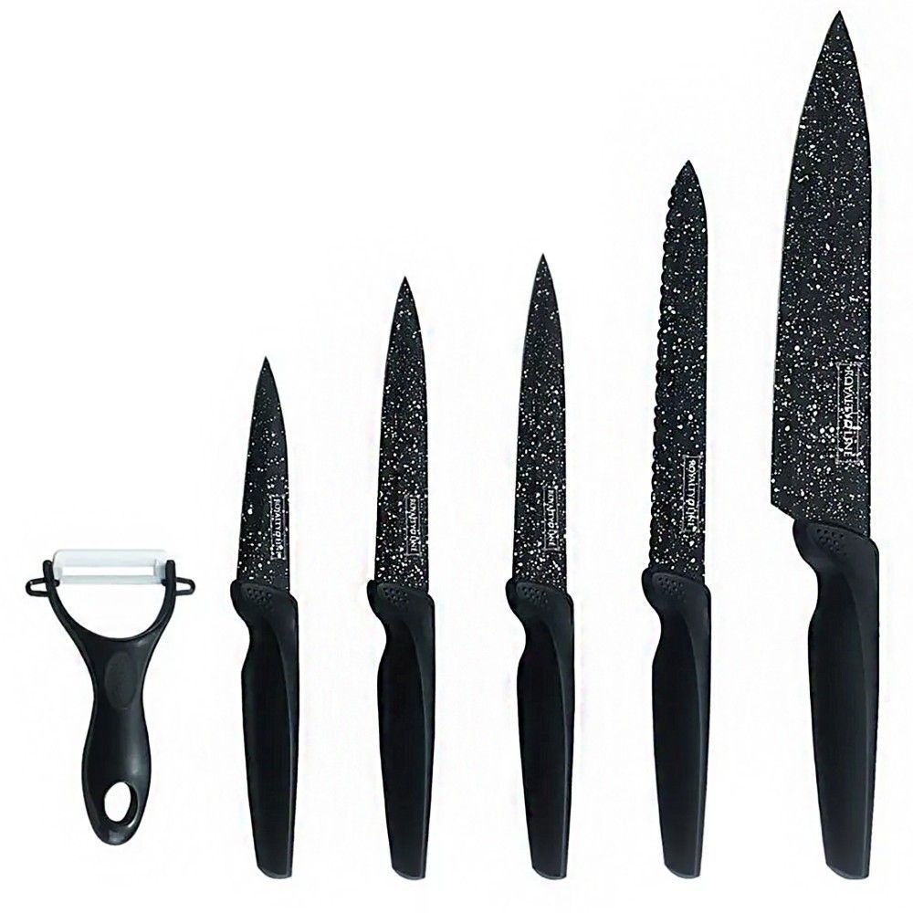 Royalty Line RL-MB5B 6-teiliges Messerset: Fünf rostfreie, korrosionsbeständige Edelstahlmesser mit antibakterieller Antihaft-Keramikbeschichtung für hygienisches, müheloses Schneiden. Rutschfeste Silikongriffe bieten sicheren Komfort. Plus vielseitiger Keramikschäler für schonendes Schälen. Kratz- und fleckenbeständige Klingen behalten ihre Eleganz. Spülmaschinengeeignet – ideal für Hobby- und Profiköche.