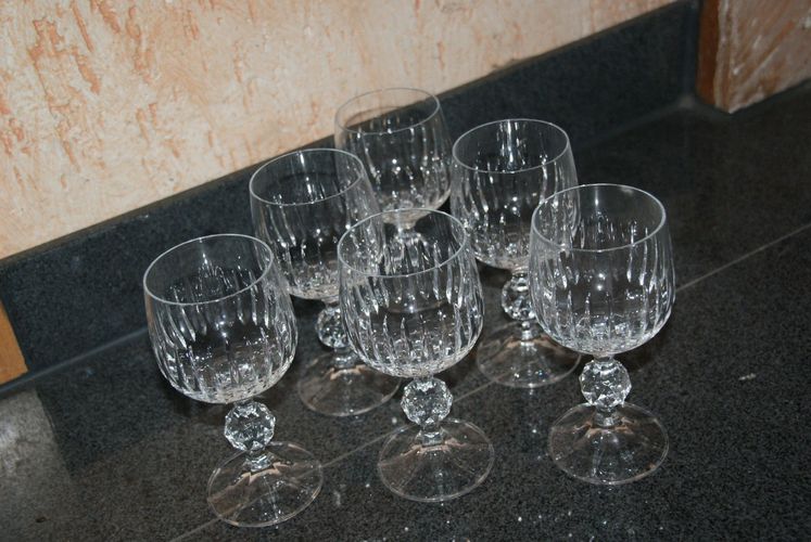 Klarglas: 5 cm Höhe: 14 cm Durchmesser Fuß bzw. Glas oben: 6 cm Höhe Stiel: 5 cm Schönes kleines Weinglas mit Längsschliff. In der Mitte des Stiels ist eine geschliffene Kugel eingearbeitet:: Der Schliff ist dem Kristallschliff nachempfunden. Die Gläser waren in Benutzung. Beschädigungen kann ich ke