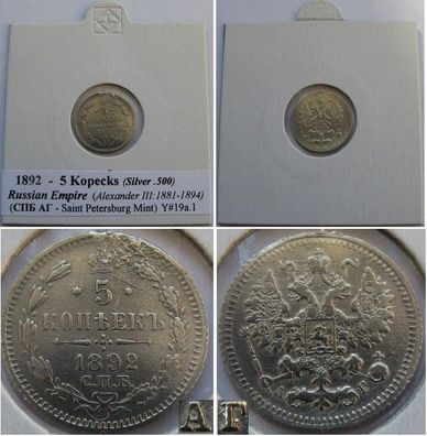 1892, Russian Empire, 5 Kopeck (AG), silver coin