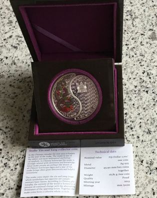 Fiji Fidschi 2013 Yin & Yang Schlange 1oz Silber PP Etui & Zertifikat