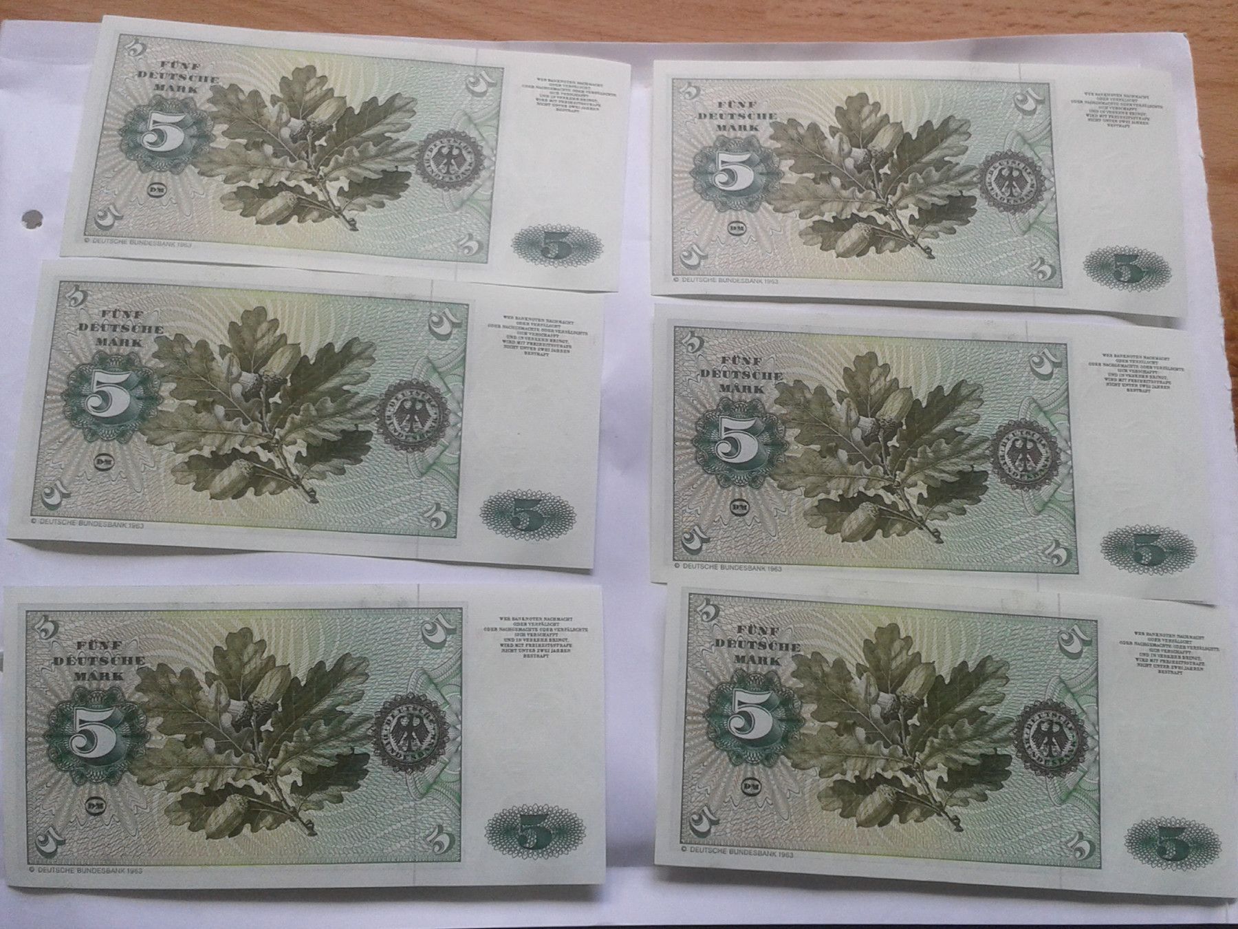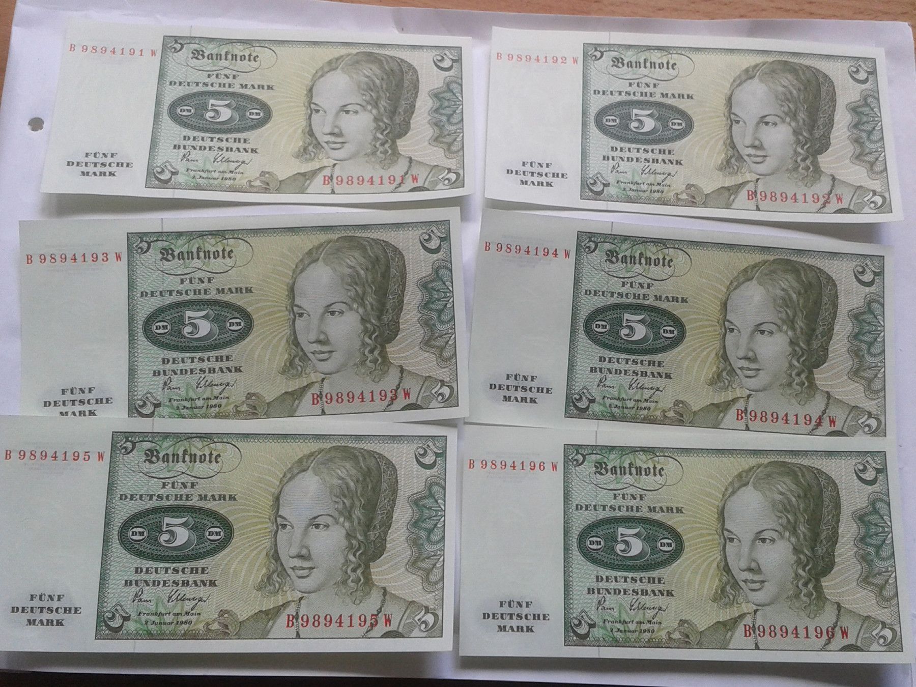 6 x 5 Mark 2.1.1980 Scheine Deutschland kassenfrisch fortlaufend nummeriert