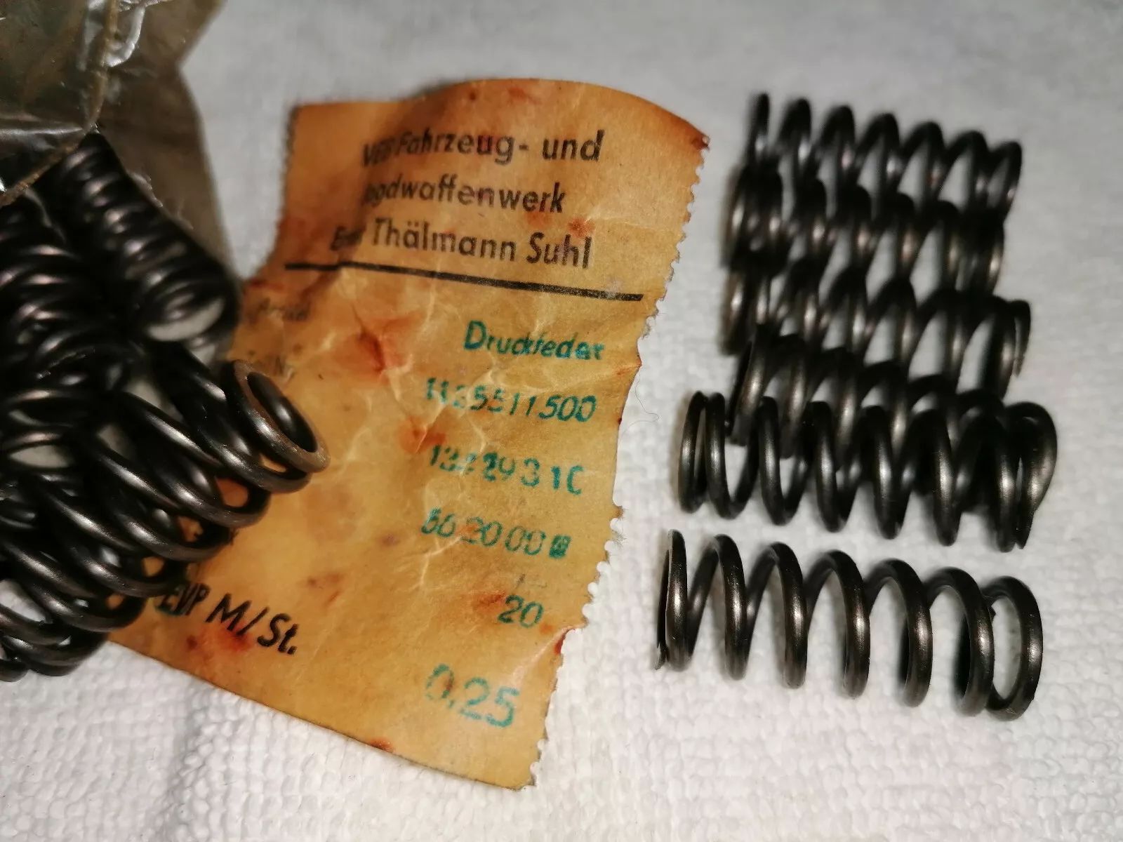 6 Stück original Simson Druckfeder orig. Teile-nr. 11 35511 500 Es handelt sich um Druckfeder für den Kupplungskorb - Soemtron und Simson M 52 / 53 / 54 Motore Verwendbar bei: S 50 // Schwalbe KR 51 und STAR Länge ca. 2,8 cm Durchmesser ca. 1,2 cm Stärke ca. 1,5 mm Die Ware stammt aus originalem DDR - Lagerbestand und war bis dato nie verbaut gewesen