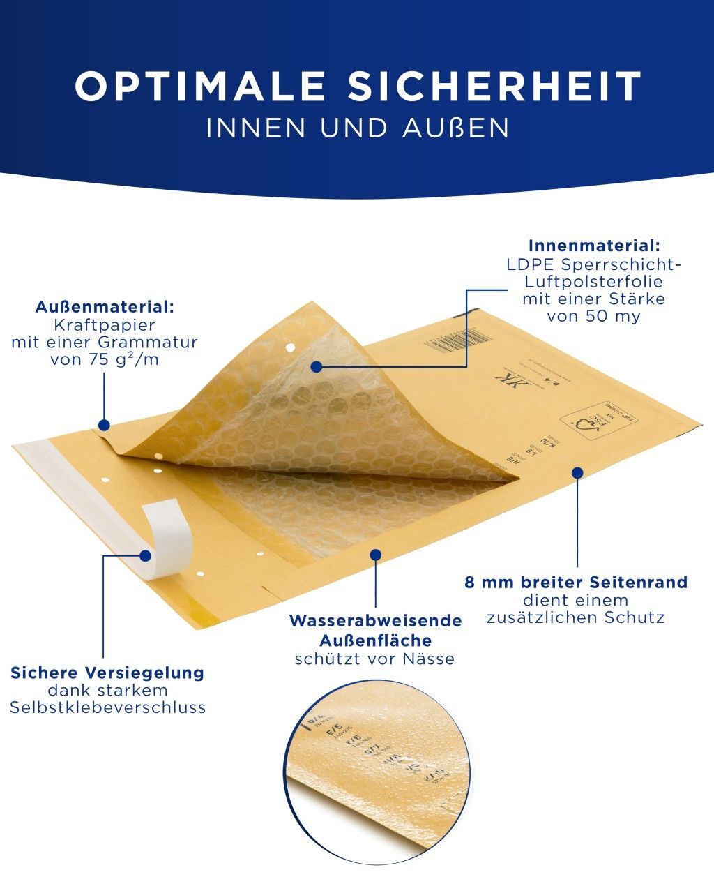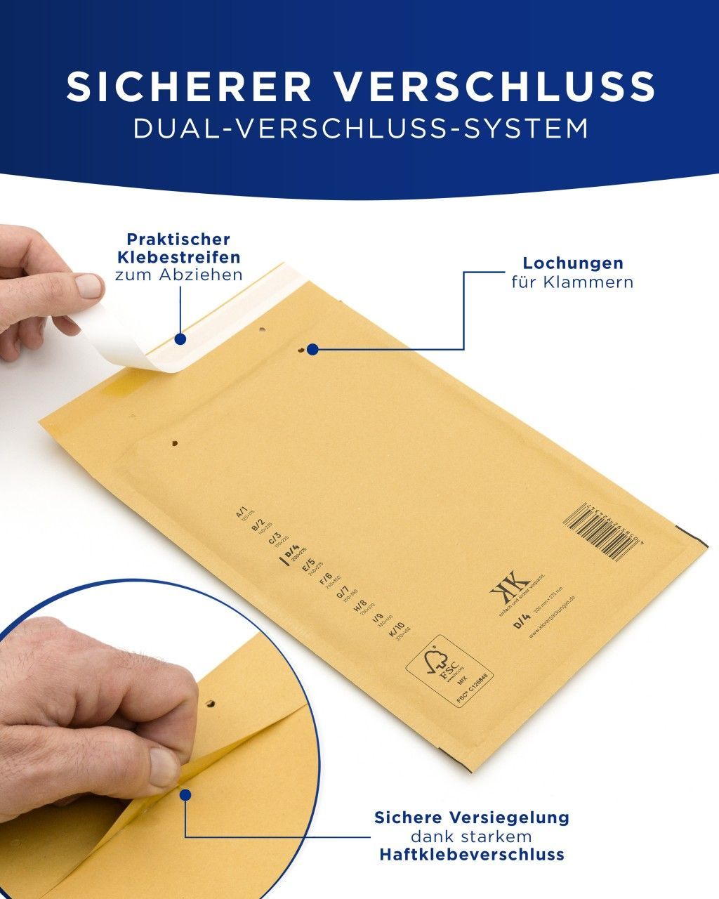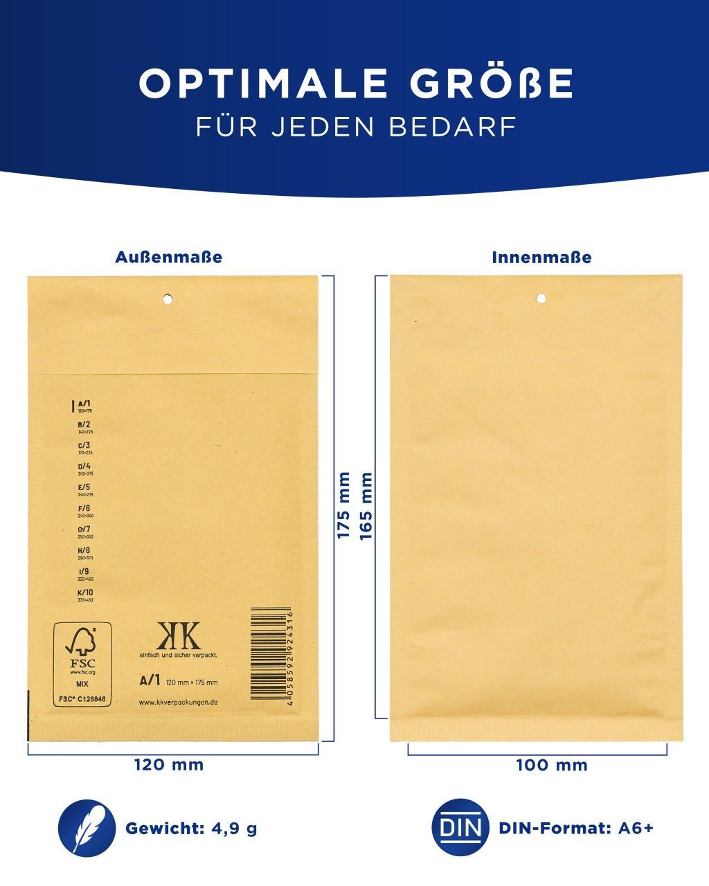 600 Luftpolster-Versandtaschen A1 A/1 120x175mm (Außenmaß) DIN A6+ Braun Optimale Sicherheit für Ihre Sendungen während des Transports Luftpolster-Versandtaschen bieten erstklassigen Schutz für Ihre Waren. Mit einer 50 my dicken LDPE-Luftpolsterfolie im Inneren, schützt sie Ihre Versandgüter effektiv vor Stößen, Erschütterungen und anderen Beschädigungen während des Transports. Das beschichtete Kraftpapier mit einem Grammgewicht von 75 g/m² schützt zusätzlich vor Feuchtigkeit und Rissen. Diese Materialkombination sorgt dafür, dass Ihre Produkte sicher verpackt sind und während des gesamten Transports bestens geschützt bleiben. Die fest verschlossenen Seitenränder sorgen dafür, dass Ihre Waren sicher und unversehrt an ihrem Zielort ankommen. Sicherer und flexibler Verschluss für zuverlässige Versiegelung Die Luftpolstertaschen sind mit einem stabilen selbstklebenden Haftverschluss ausgestattet, der für eine zuverlässige Versiegelung sorgt. Der Klebestreifen ermöglicht eine manipulationssichere Versiegelung und sorgt dafür, dass Ihre Sendungen während des Transports gut geschützt bleiben. Für zusätzliche Flexibilität und Sicherheit sind die Versandtaschen mit einem Dual-Verschluss-System ausgestattet. Neben dem klassischen Haftklebeverschluss bieten die integrierten Lochungen für einen Klammerverschluss zusätzliche Verschlussmöglichkeiten, was den Gebrauch noch vielseitiger macht. Vielseitige Verwendungsmöglichkeiten für sicheren Versand von Produkten Mit einem Gewicht von nur 4,9 g sind unsere gepolsterte Versandtaschen besonders leicht und haben minimalen Einfluss auf das Gesamtgewicht der Sendung. Sie sind ideal für den Versand von Dokumenten, Briefen, Rechnungen und kleinen Gegenständen. Diese gepolsterten Versandtaschen sind sowohl in Büros als auch zu Hause, in Geschäften und Schulen von großem Nutzen. Sie sind besonders geeignet für den Versand empfindlicher und zerbrechlicher Artikel wie Schmuck, elektronische Geräte oder handgefertigte Produkte, bei denen der Schutz und die Sicherheit an erster Stelle stehen. Nachhaltigkeit und umweltfreundliche Optionen für den Versand Unsere Luftpolstertaschen sind 100 % recycelbar und tragen somit aktiv zur Reduzierung des Abfallaufkommens bei. Sie bieten eine nachhaltige Lösung, da sie nach Gebrauch recycelt werden können. Bitte trennen Sie die Polsterfolie vom Kraftpapier und entsorgen Sie diese getrennt. Das Außenmaterial besteht aus FSC-zertifiziertem Kraftpapier, was zur Förderung der Nachhaltigkeit beiträgt. Darüber hinaus bietet die Möglichkeit, die Taschen mehrfach zu verwenden, einen weiteren Beitrag zur umweltbewussten Nutzung. Passende Formate für einen sicheren Versand Ihrer Produkte Die Polsterumschläge im Format A1 bieten Innenmaße von 100 x 165 mm und Außenmaße von 120 x 175 mm (unbefüllt). Sie sind perfekt geeignet, um Artikel im DIN A6+ Format (flach) sicher zu versenden. Diese Luftpolser-Versandtaschen bieten optimalen Schutz und stellen sicher, dass Ihre Sendungen unversehrt an ihrem Bestimmungsort ankommen. Technische Daten Größe: A1 Außenmaße: 120 x 175 mm Dimensions intérieures : 100 x 165 mm Breite vom Seitenrand: 8 mm DIN-Format: A6+ Farbe: Braun Poids : 4,9 g Außenmaterial: FSC-zertifiziertes Kraftpapier mit einer Grammatur von 75 g/m² Innenmaterial: LDPE Sperrschicht-Luftpolsterfolie mit einer Stärke von 50 my Verschluss: Selbstklebender Haftverschluss mit einer Breite von 10 bis 12 mm, Lochungen für Klammer-Verschluss Nachhaltigkeit: 100% recyclebar, FSC-zertifiziert
