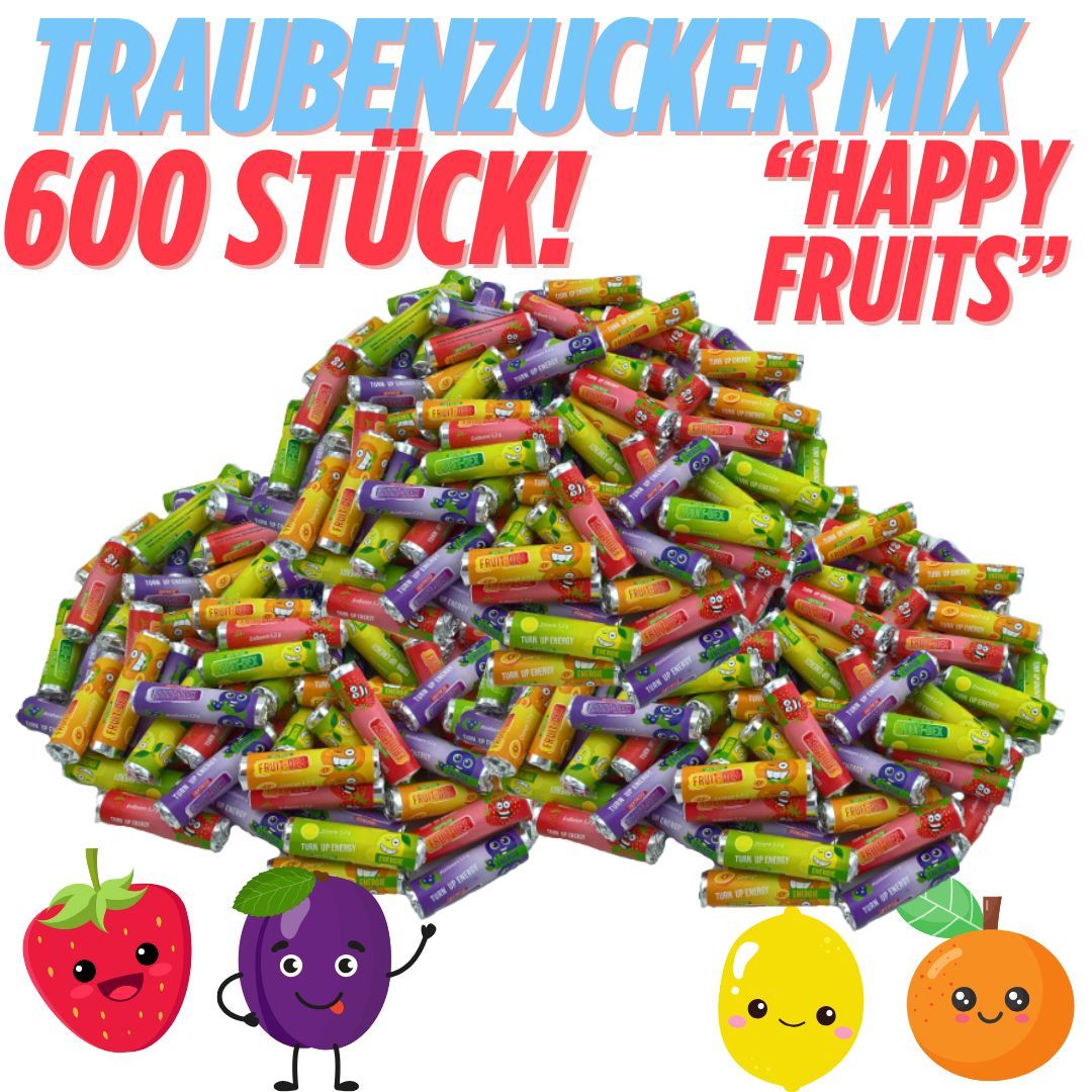 Wie viele Röllchen sind enthalten? Genau 600 einzeln verpackte Traubenzucker Röllchen in vier fruchtigen Sorten. Eignet sich das Produkt als Wurfmaterial? Ja perfekt für Fasching Karneval und Fastnacht sowie als Giveaway bei Events. Ist der Traubenzucker fruchtig? Ja mit echtem Fruchtsaftpulver für leckeren Geschmack und schnellen Energie Kick. Für welche Zielgruppe geeignet? Für Kinder Erwachsene bei Messen Partys Schule Firmen Events und Vereinen.