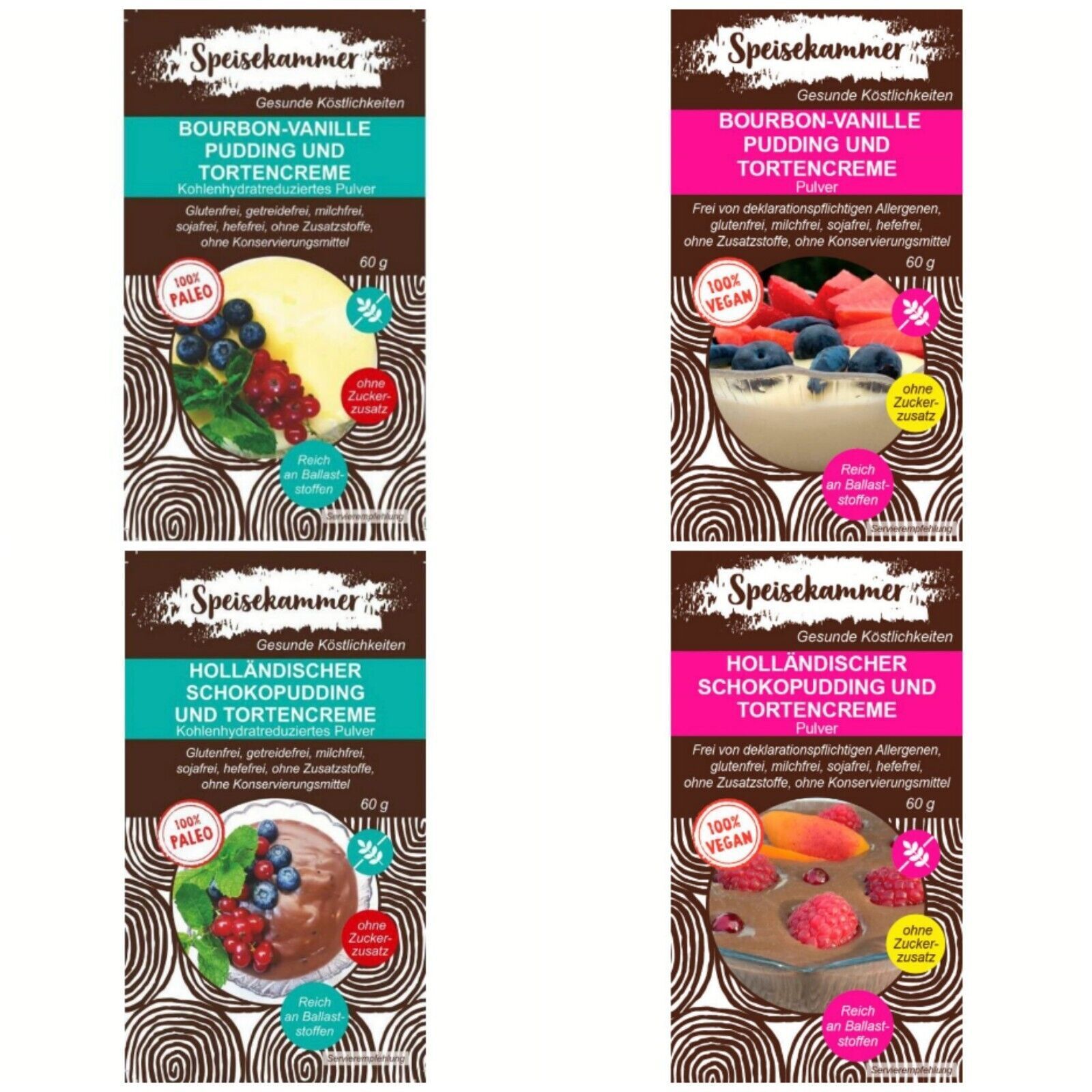 Paleo Bourbon-Vanille Pudding Pulver 60g, Paleo Schokopudding Pulver 60g, Vegan Bourbon-Vanille Pudding Pulver 60g