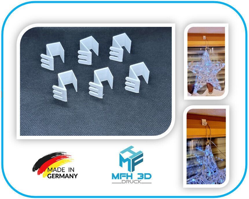 MFH 3d Druck Die Faszination des 3D Druck im täglichen Leben, erleben! Senden Sie uns eine Nachricht Unser Shop Verkäuferprofil Bewertungen Über uns Kontakt 6er Set Fensterhaken zum Einhängen für Deko Haken Fensterdekoration Ultra praktischer Haken für die Befestigung Ihre Weihnachtsbeleuchtung am F